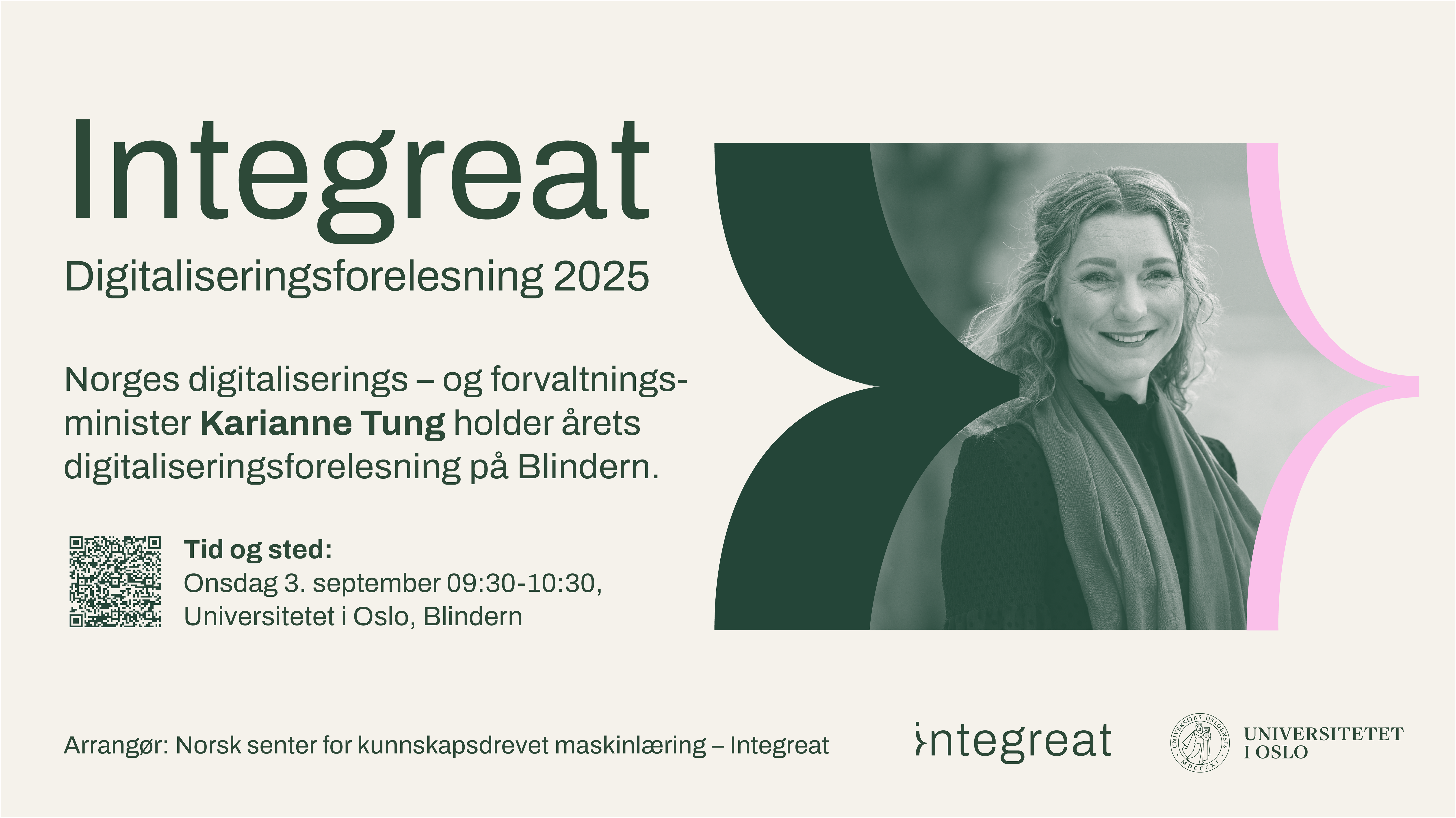 – Digitaliseringsforelesningen er en årlig tradisjon der statsråden gir en status for digitaliseringen i Norge, med vekt på utviklingstrekk, utfordringer og Regjeringens løsninger. Dette er en unik anledning til å stille spørsmål direkte til digitaliseringsministeren og delta i en samtale om hvordan teknologi former fremtiden, sier professor Arnoldo Frigessi, senterleder i Integreat.