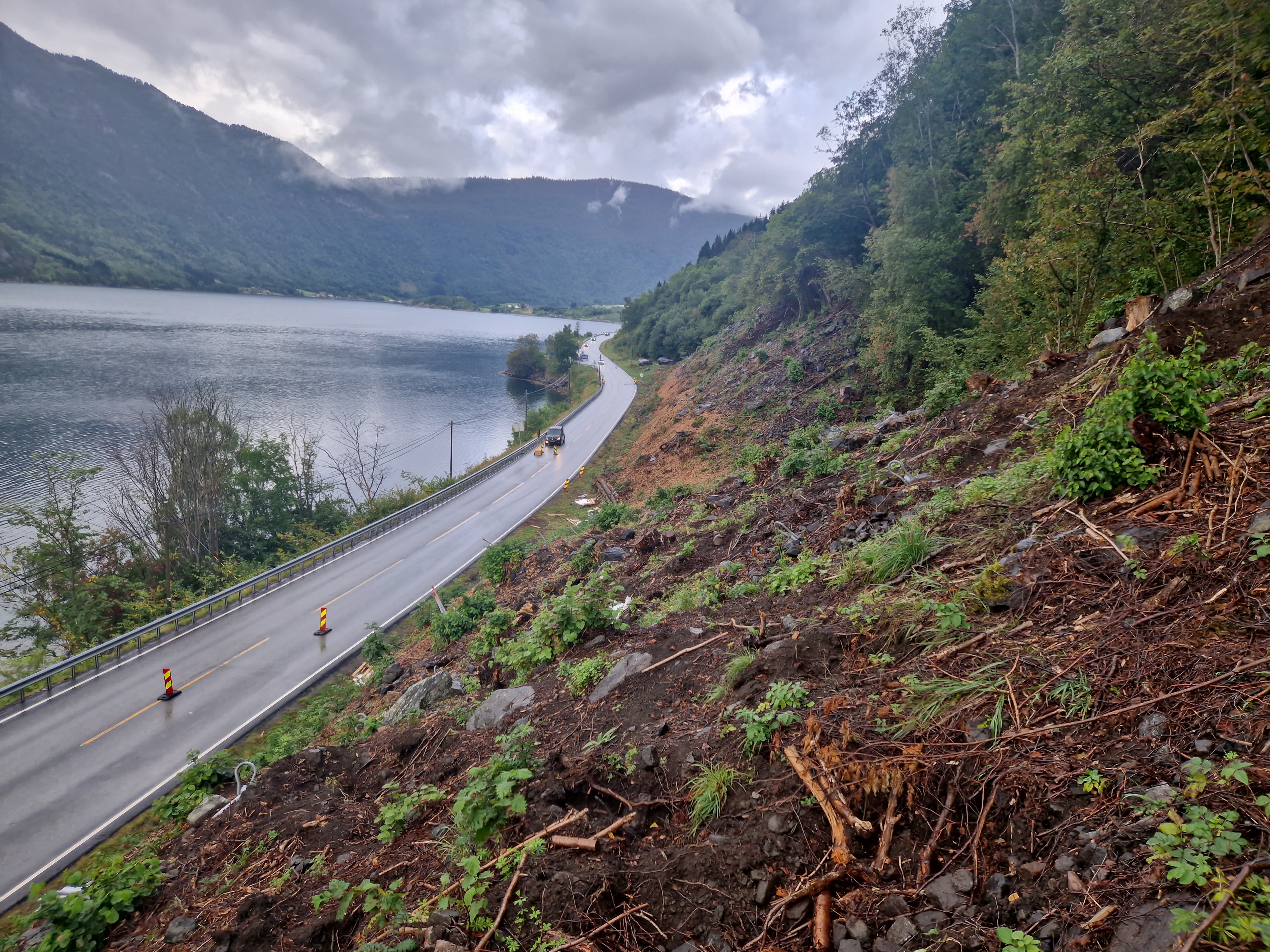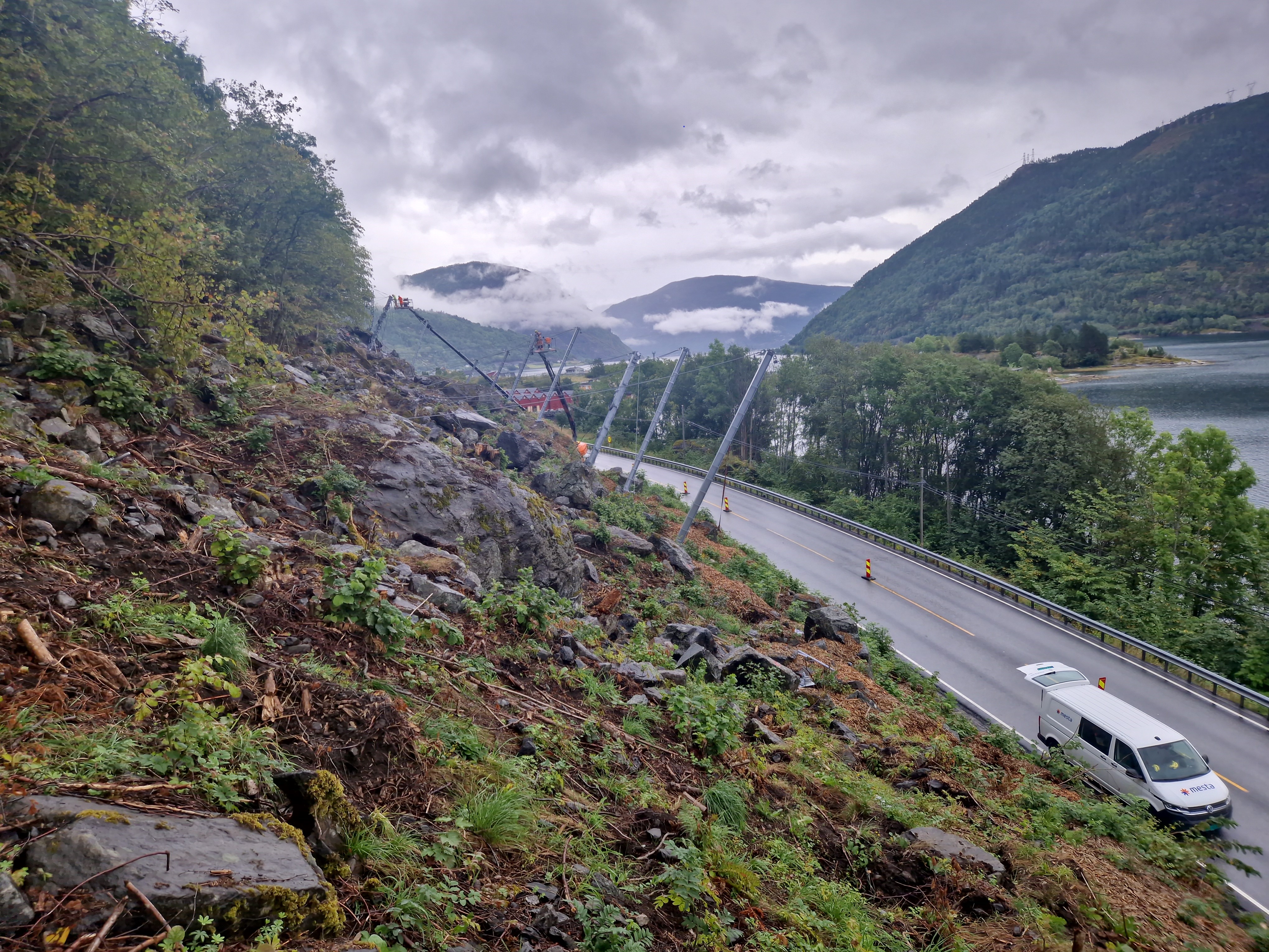 Statens vegvesen held på med skredsikringsarbeid ved rv. 13 på Ylvisåker mellom Sogndal og Leikanger.