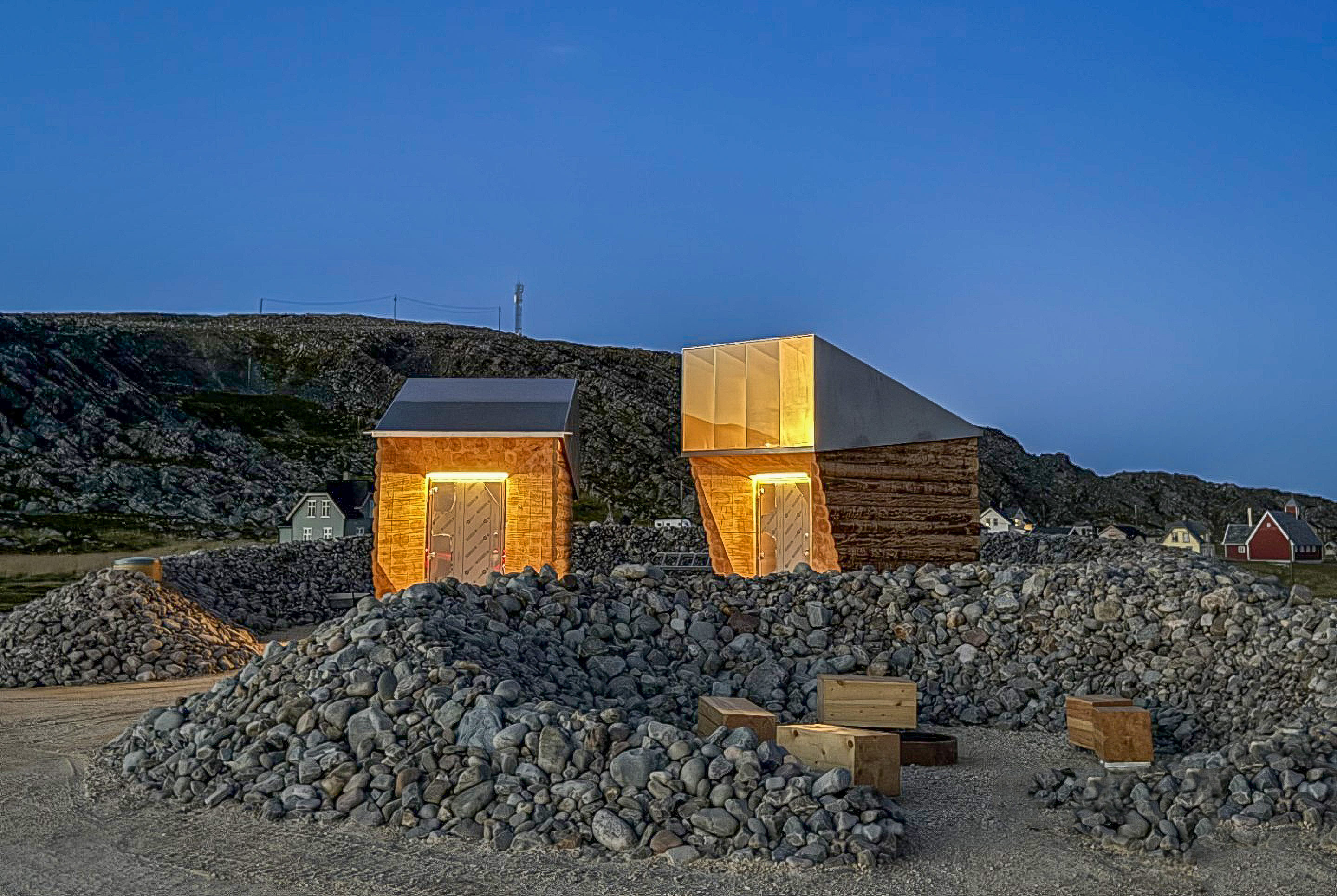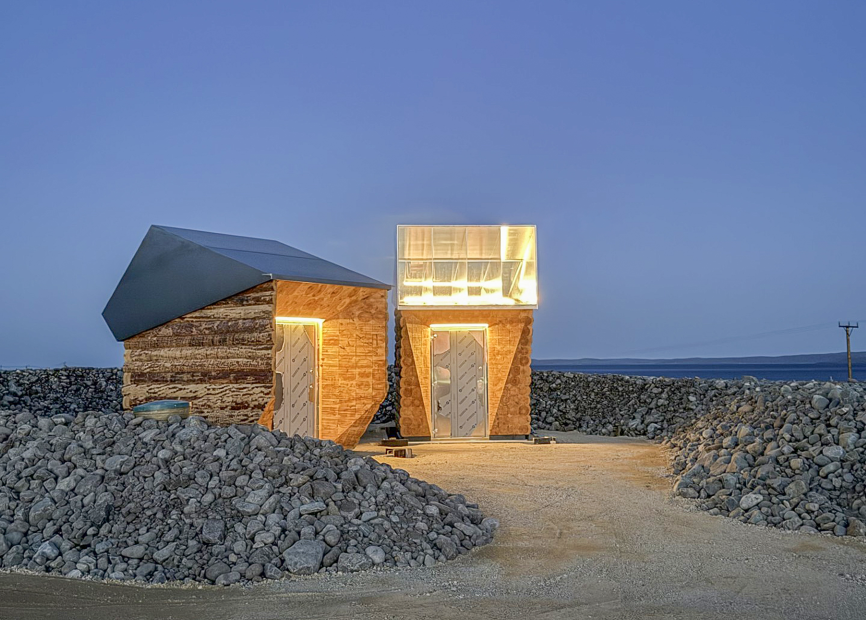 -Fire av disse inneholder sittesoner med benker, en har en avfallsstasjon, mens den største inneholder to toalettbygg. Toalettbyggene har en arkitektur som er inspirert av tradisjonell laft kombinert med takformer som tar midnattssolen inn i byggene og som speiler omgivelsene rundt, sier Broch Moe.
