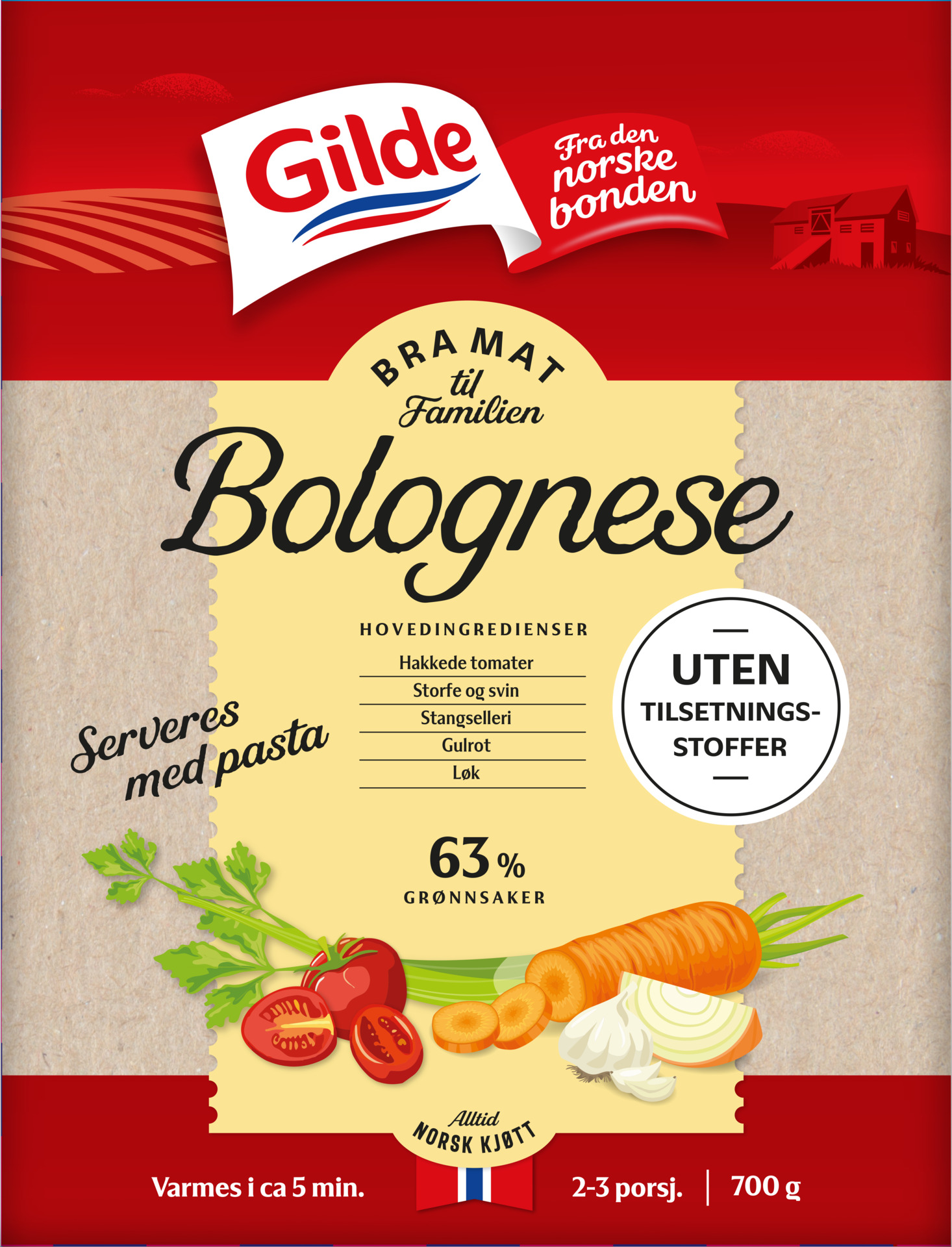 Et nytt tilskudd i Gildes ferdigmatserie, Bra mat til familien. Dette er en fyldig saus med storfe- og svinekjøttdeig, samt grønnsaker som tomat, gulrot, selleri og løk. Bolognesen er uten tilsetningsstoffer. (Ikke ultraprosessert ihht. NOVA-klassifisering)