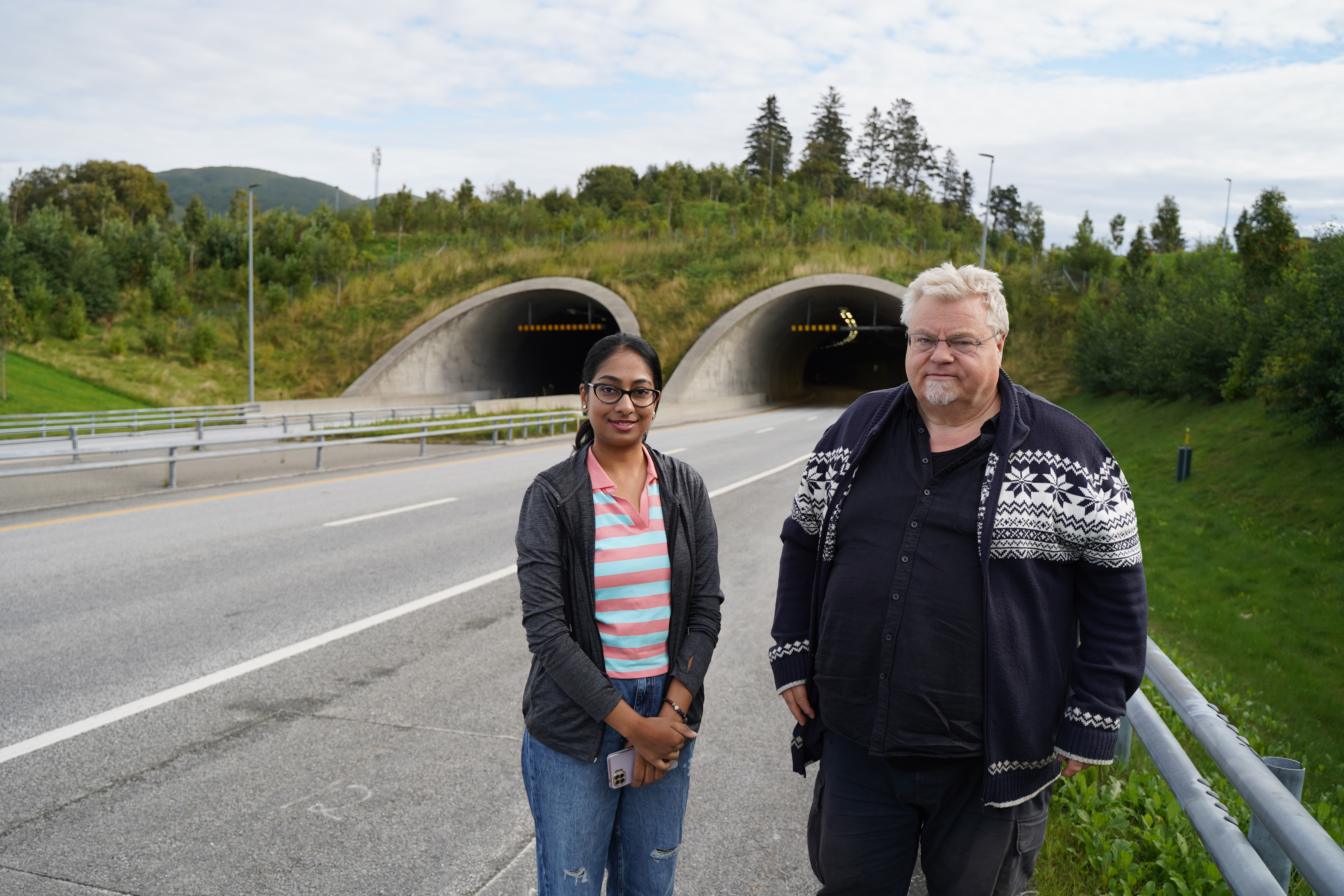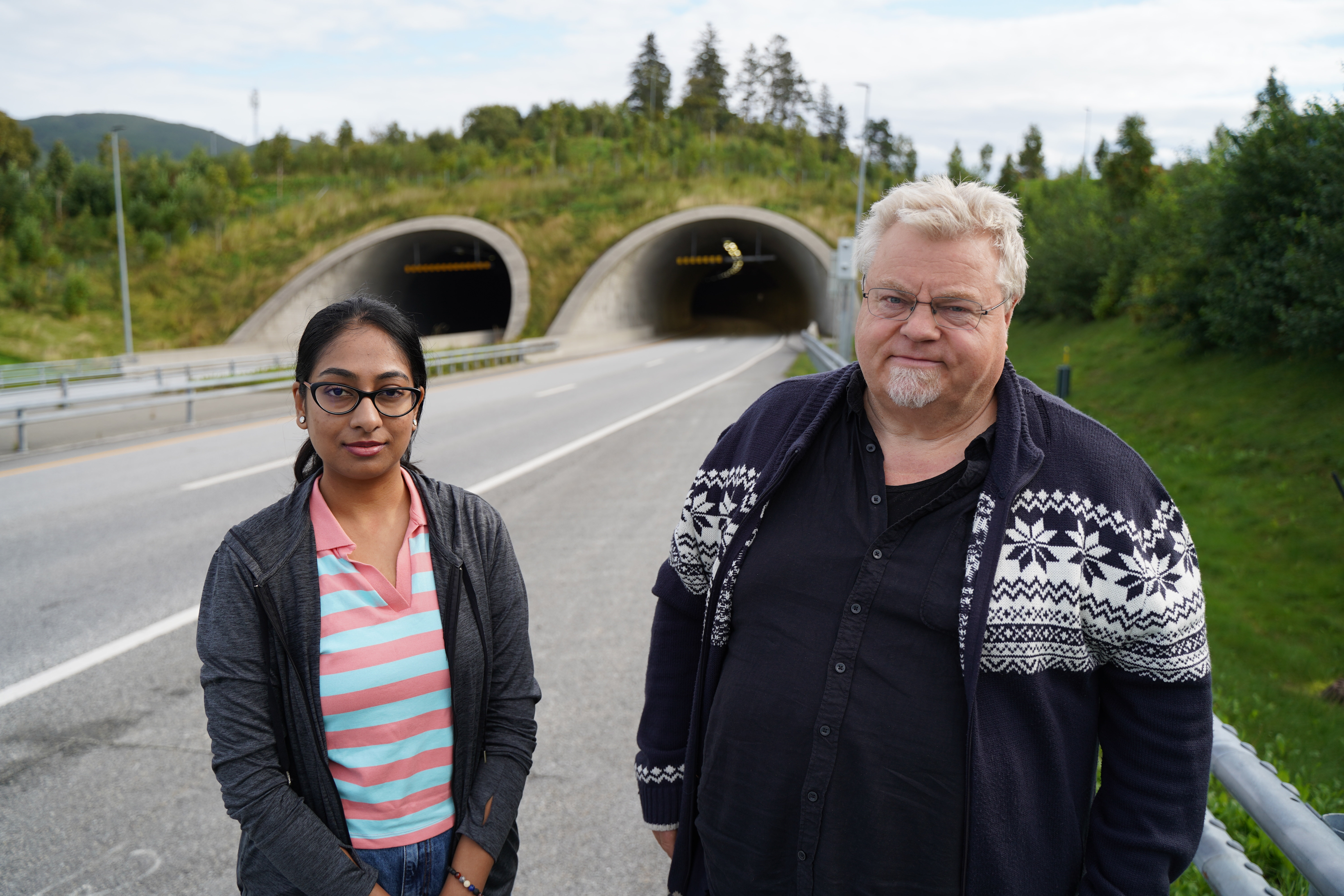 Overraska over resultata: Masterstudent Chinmayi Ramaghatta saman med rettleiar og professor Pål Asgeir Olsvik framfor Bodøtunellen. Foto: Nord universitet.