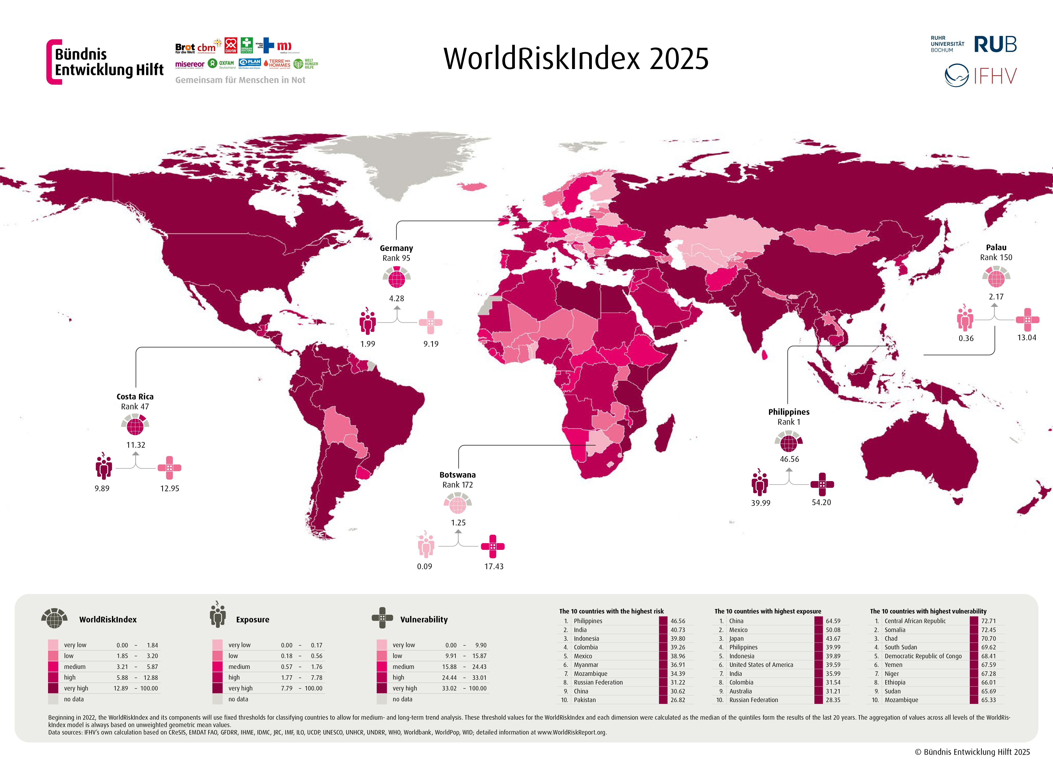 The WorldRiskIndex assesses the disaster risk of all 193 UN member states. In 2025, the global risk hotspots are again in Asia and Latin America. The top 10 countries with the highest risk are: