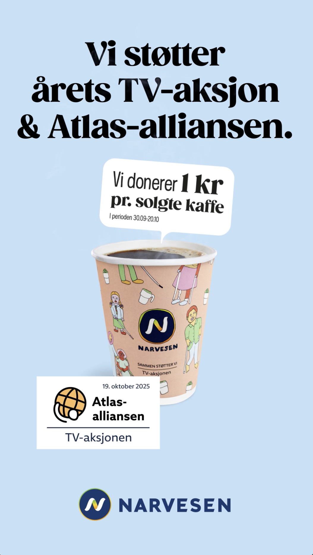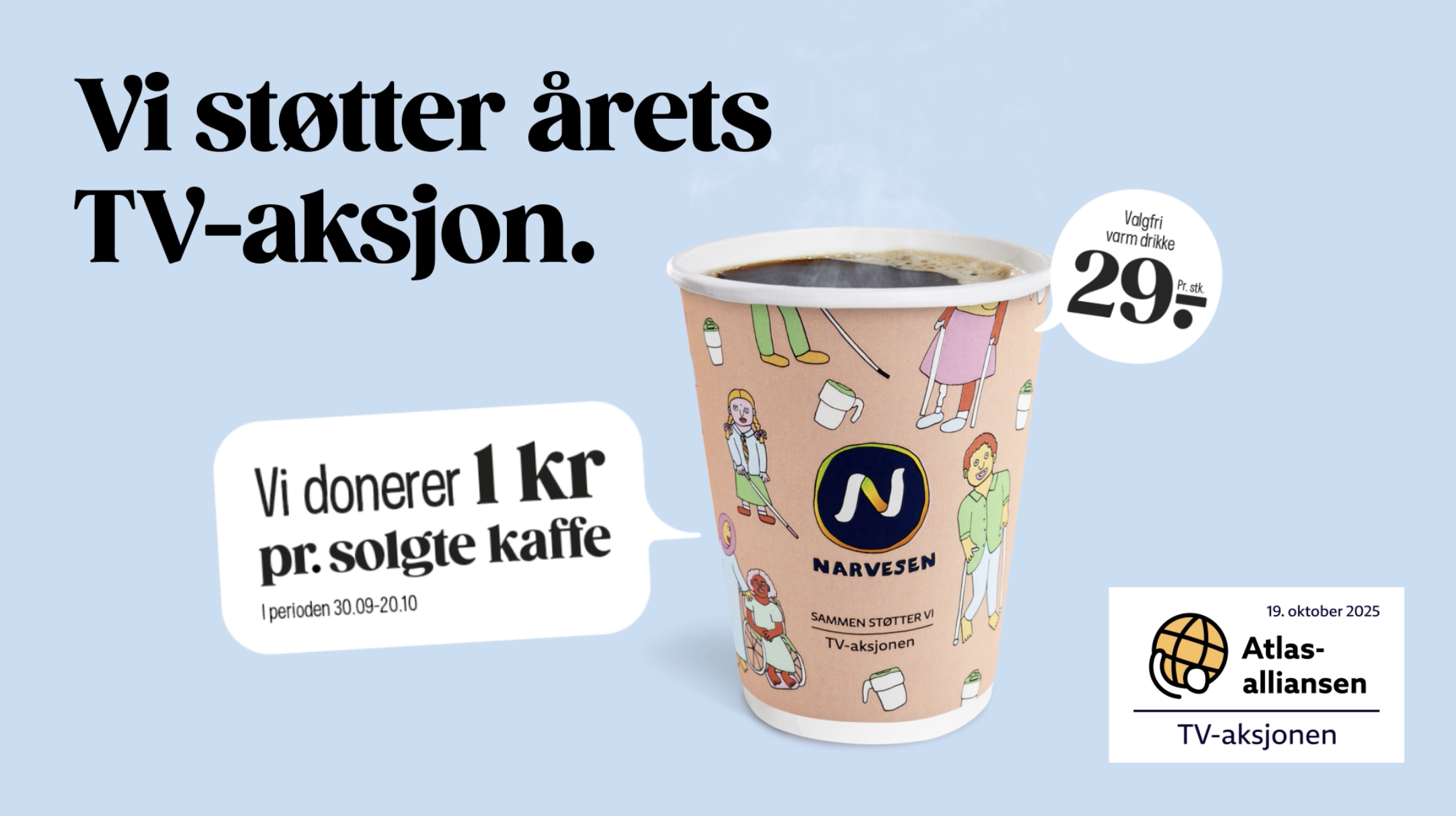 I tre uker fra tirsdag 30. september donerer Narvesen 1 kr per solgte kaffekopp og varm drikke til TV-aksjonen. Kaffekampanjen er en årelang tradisjon for kioskkjeden, og denne gangen lanseres også selve kaffekoppen i ny drakt. Den kjente illustratøren Anette Moi står bak designet, som er inspirert av årets sak.