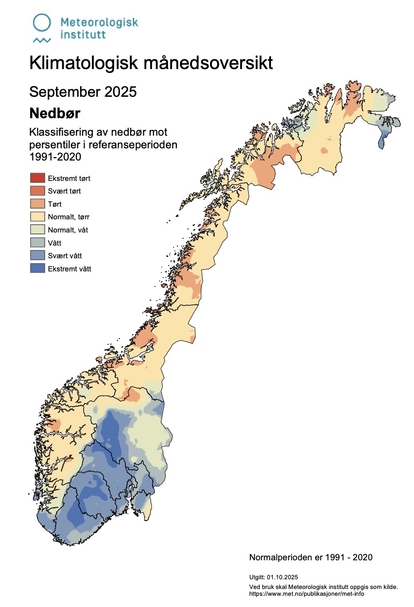 September var for det meste tørr, med nokre unntak. På delar av Austlandet, i Agder og Rogaland var månaden høvesvis “Våt”, “Svært våt” og “Ekstremt våt”.