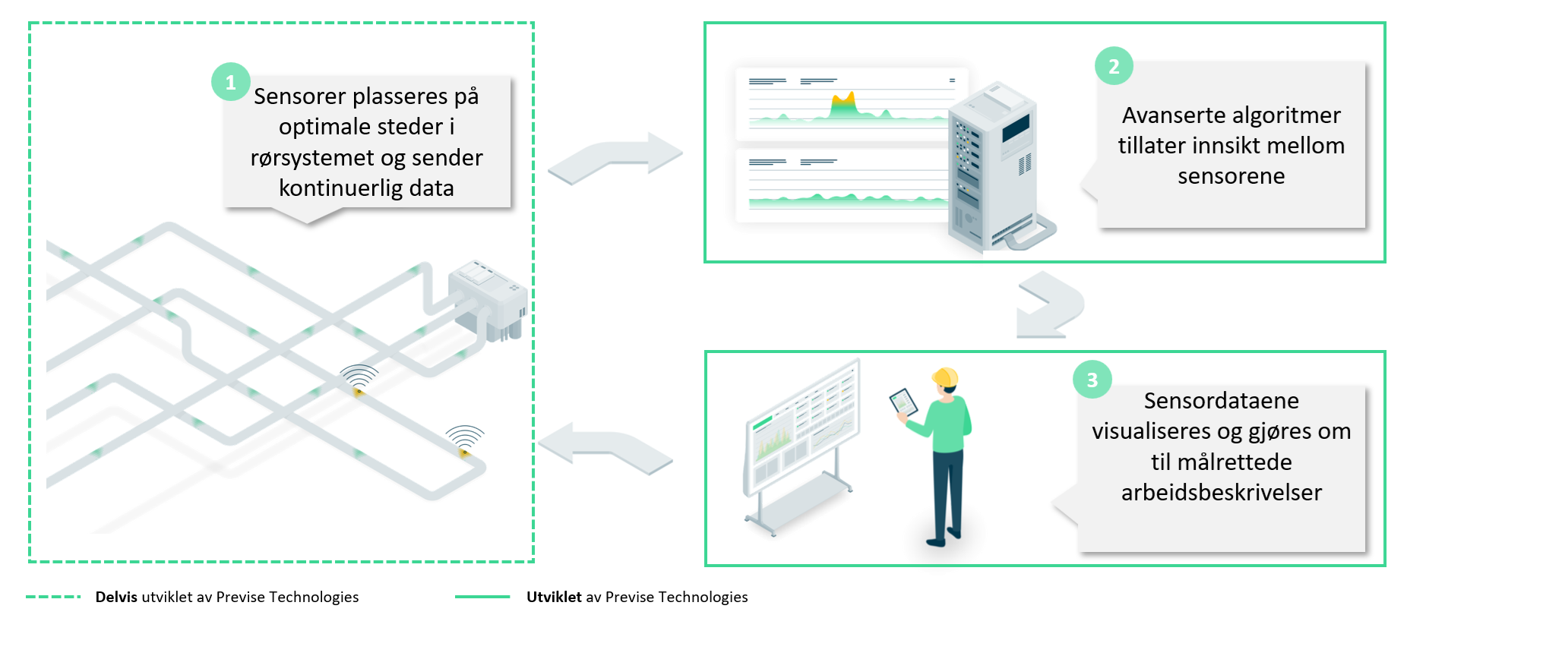 Teknologien minner om en slags «værvarsling» for isolasjonen. Smarte sensorer registrerer hvor vann finnes, mens avanserte fysikkmodeller og statistiske verktøy analyserer hvordan vannet beveger seg. Dermed kan vedlikehold styres nøyaktig dit rust faktisk kan oppstå, uten å måtte åpne hele rørsystemer.