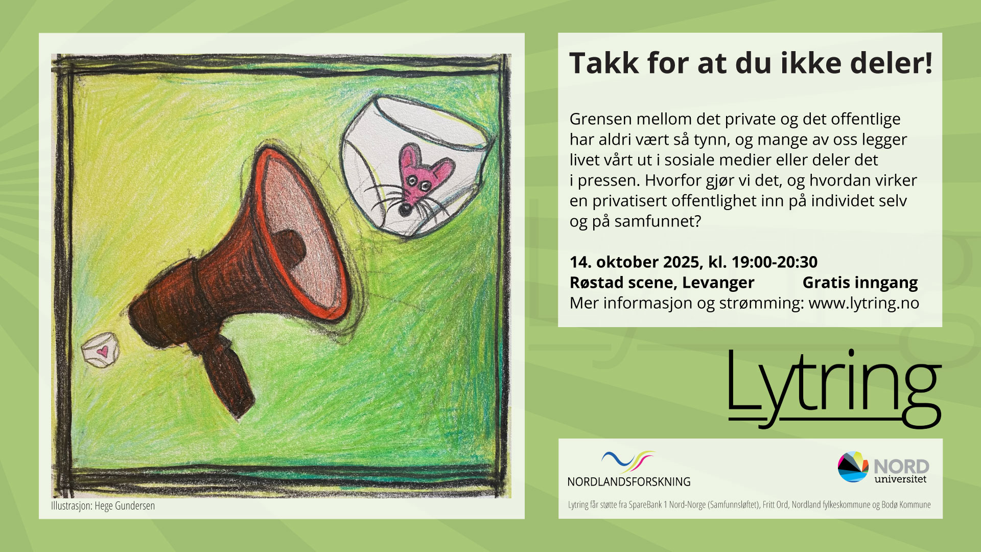 “Takk for at du ikke deler” arrangeres av Lytring på Røstad Scene i Levanger 14. oktober kl. 19.00. Arrangementet er gratis og åpent for alle.