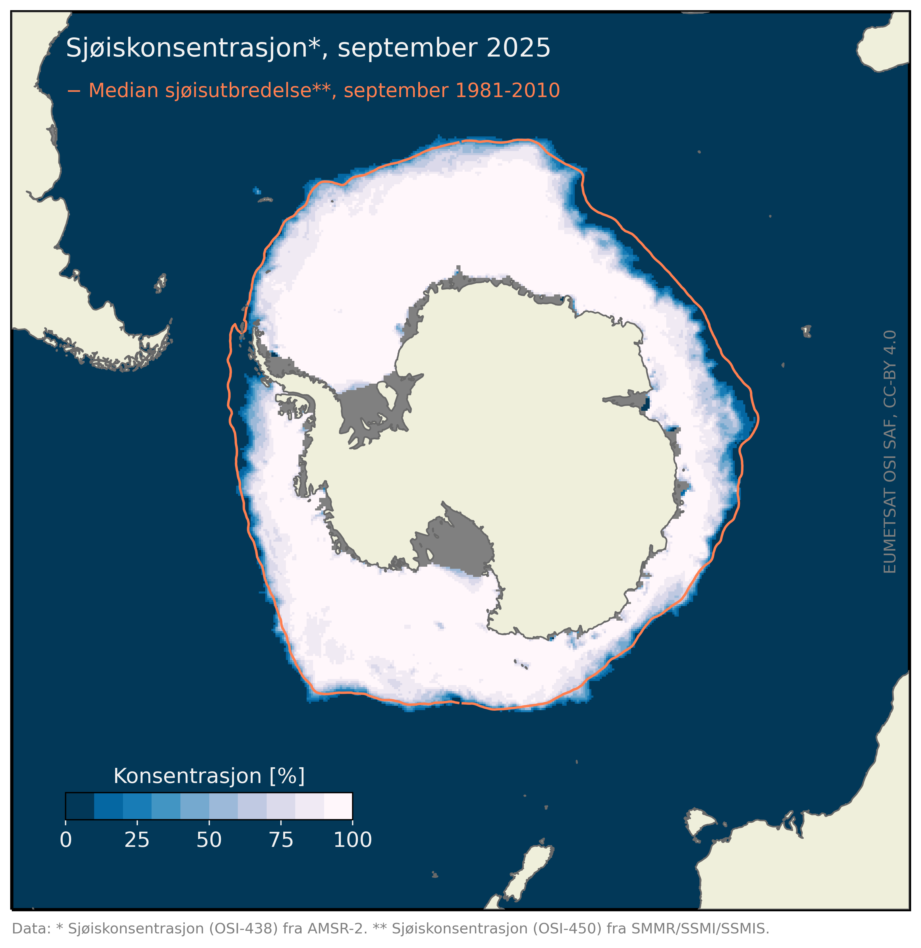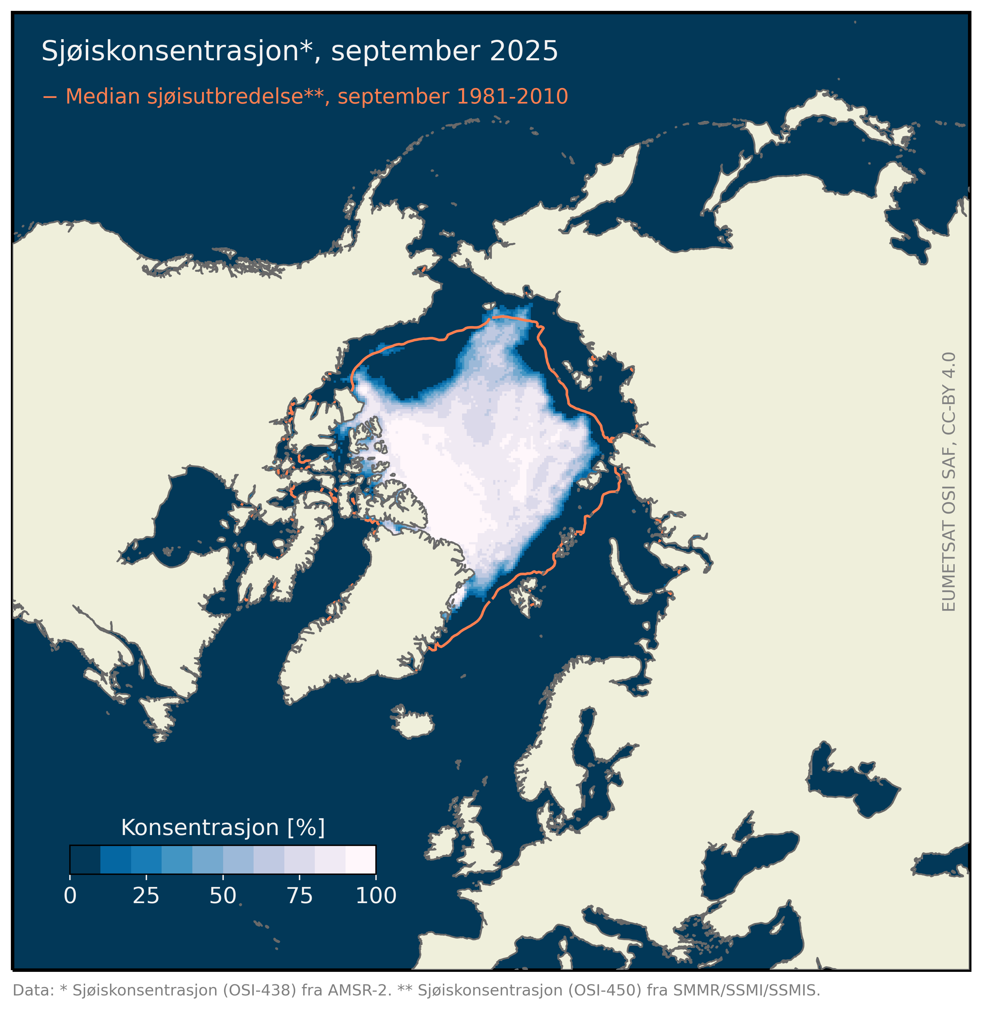 MET overvåker den globale sjøisutbredelsen med satellittobservasjoner som en del av den europeiske Ocean and Sea Ice Sattelite Application Facility (OSI SAF) tjenesten. Tjenesten er tilknyttet EUMETSAT (eumetsat.int) som Norge er et medlemsland av, og er et samarbeid blant annet med det danske meteorologiske institutt DMI. Følg med på sjøisutbredelsen her.