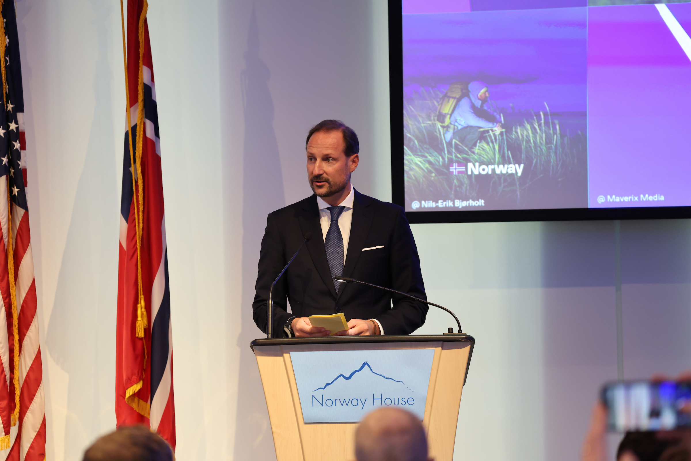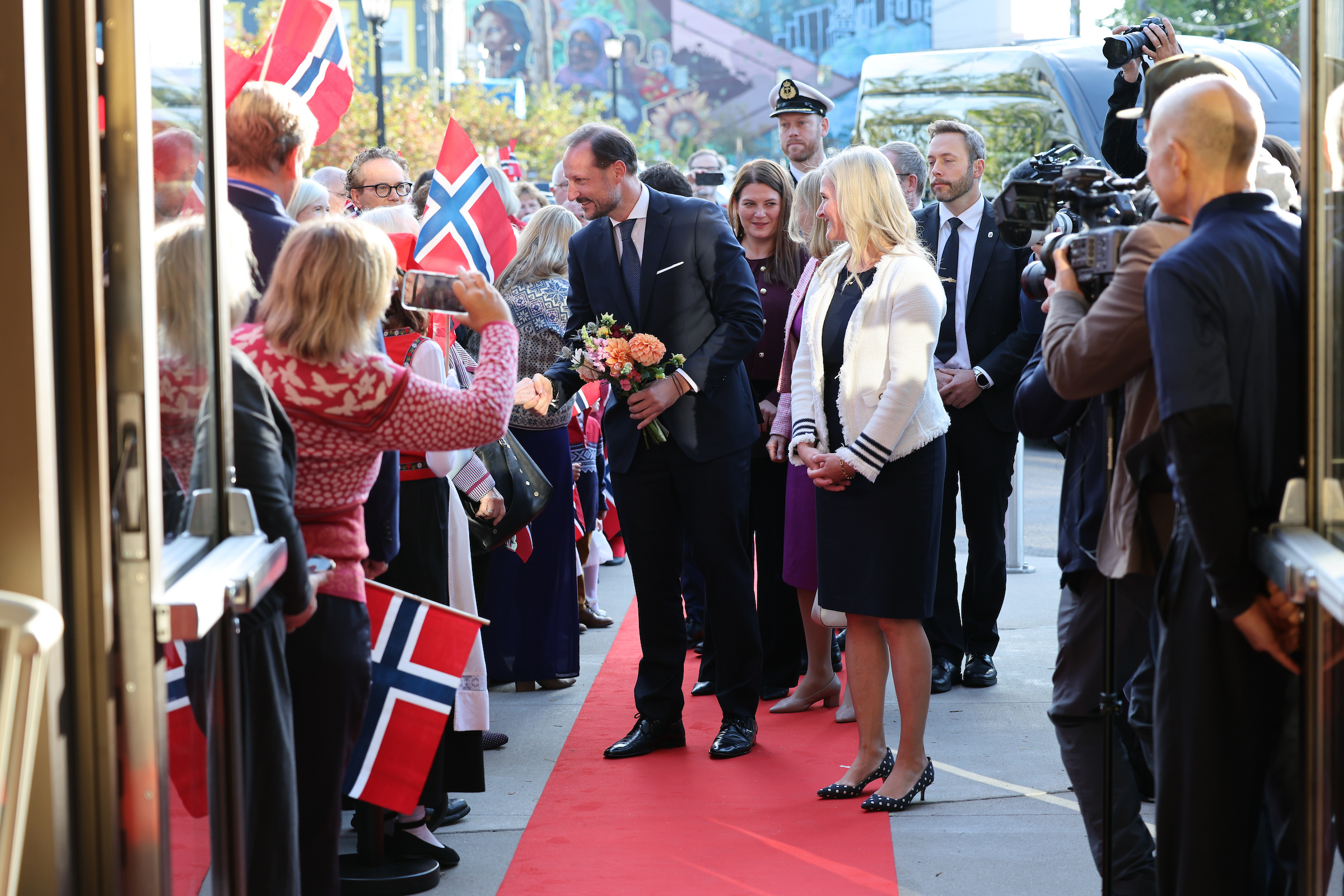 Kronprins Haakon ble møtt av norske flagg og norsk-amerikanere i alle aldre i bunad utenfor Norway House i Minneapolis.