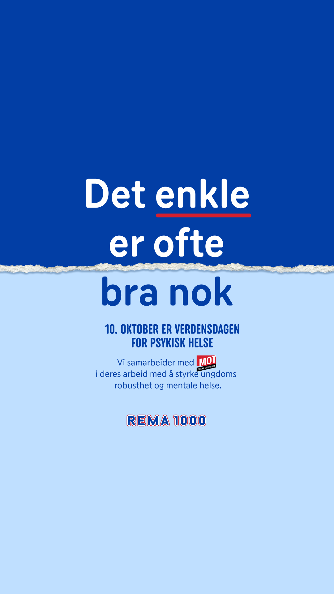 I anledning Verdensdagen for psykisk helse erstatter REMA 1000 sine vanlige kampanjer med ett enkelt budskap: «Det enkle er ofte bra nok». – I en tid hvor mange opplever både press og uro trenger folk å høre at det enkle ofte er bra nok, sier Pia Mellbye, direktør for salg og marked i REMA 1000.