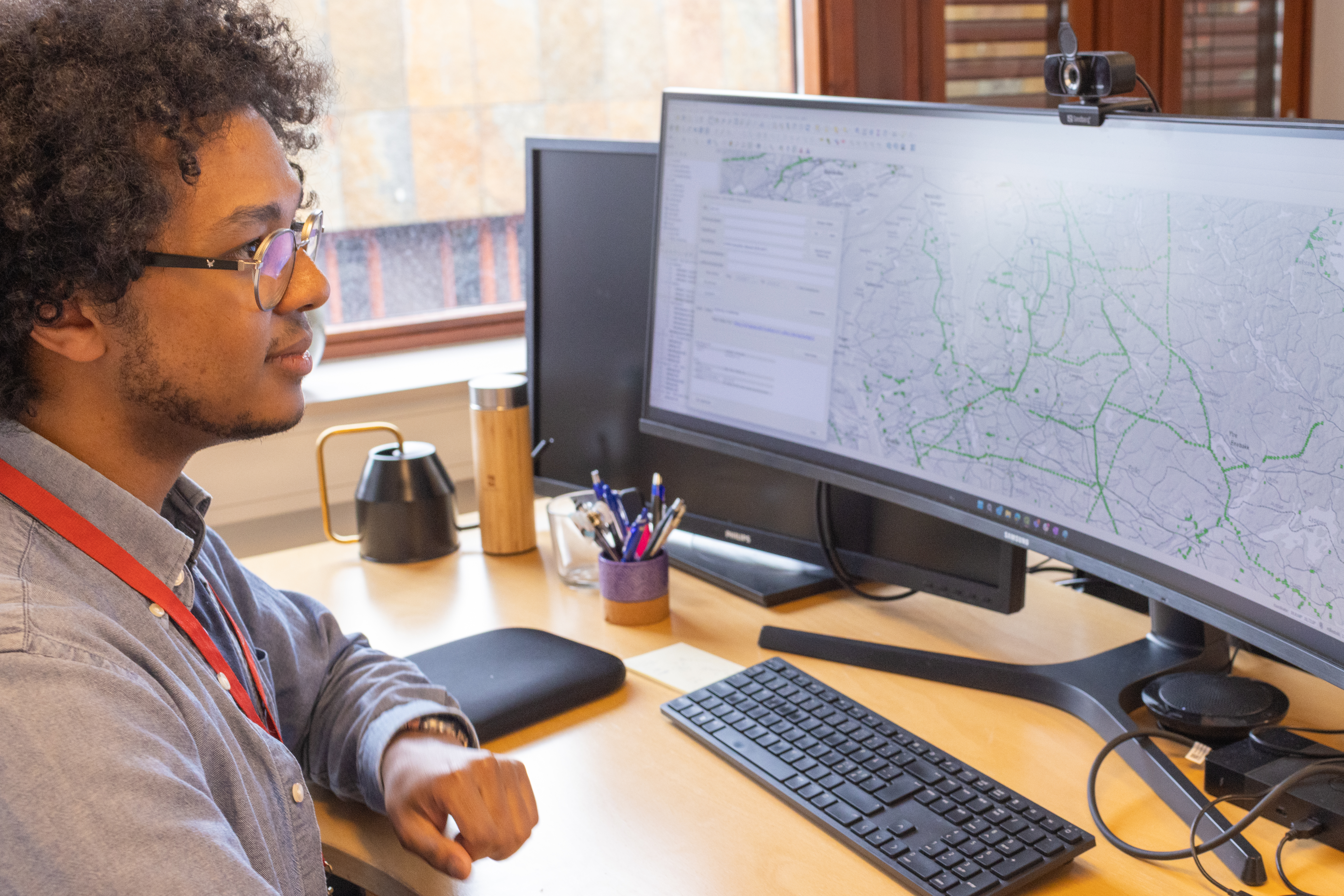 Person som sitter ved et skrivebord og ser på geografiske data på en stor skjerm.