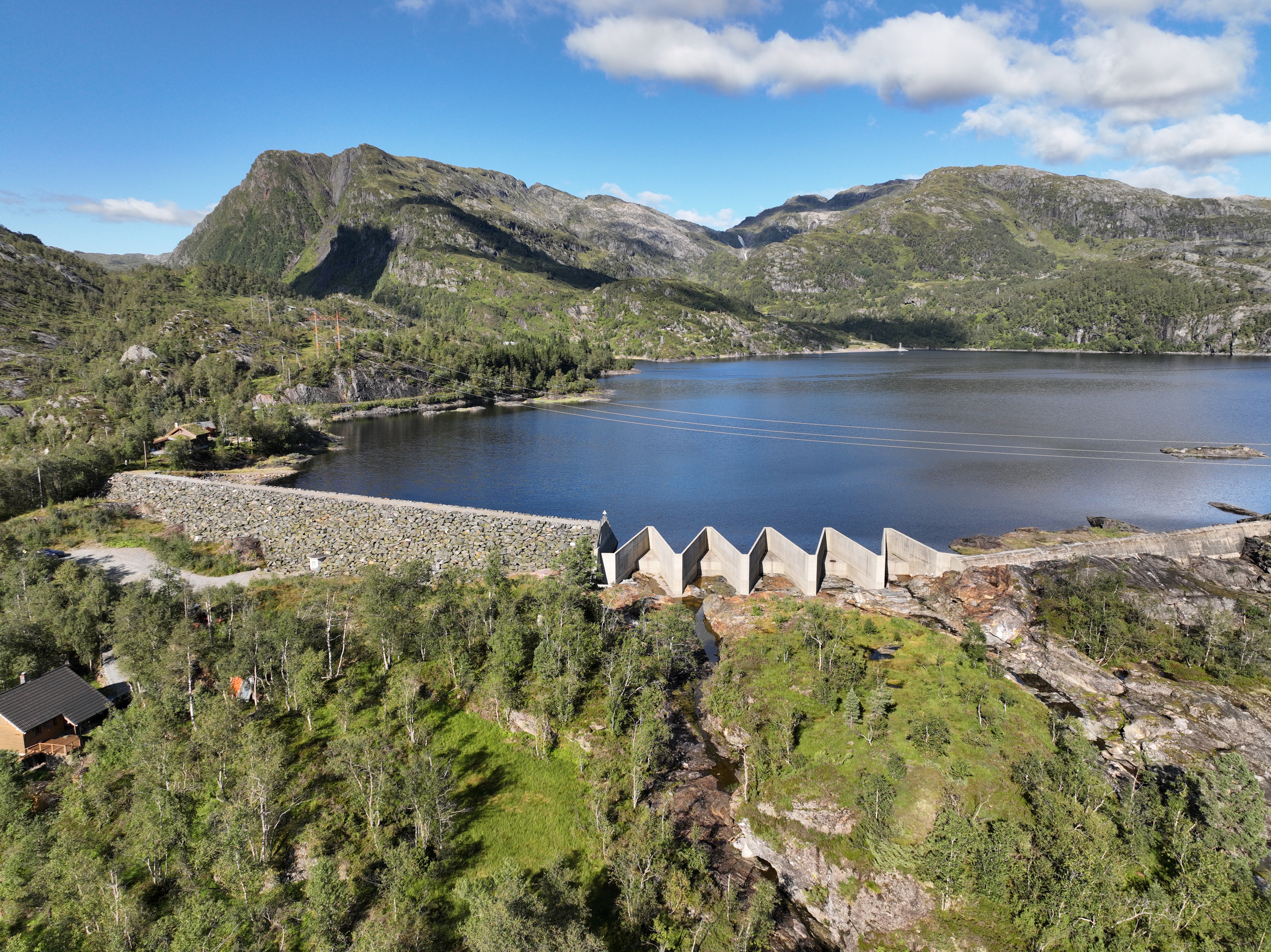Bilde av Kvitingsvatnet omgitt av fjell og skoger, med en damkonstruksjon i forgrunnen.