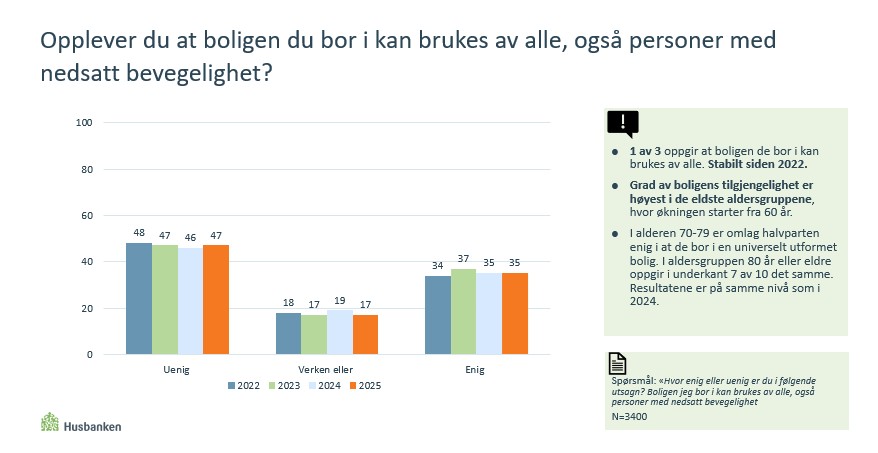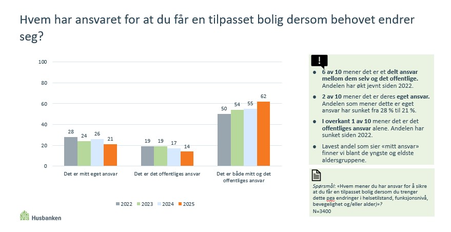 2025 er det fjerde året på rad hvor Husbanken har undersøkt befolkningens boforhold og boligpreferanser. Fra 2022 til 2025 har andelen som mener at den enkelte og det offentlige har et delt ansvar for at den som trenger det får en tilpasset bolig dersom behovet endrer seg, økt fra 50 prosent til 62 prosent