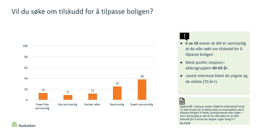 Seks av ti innbyggere svarer i Husbankens boligundersøkelse for 2025 at det er sannsynlig eller svært sannsynlig at de vil søke om tilskudd til tilpasning for å kunne bo lenger i egen bolig, dersom et slikt tilskudd blir innført.