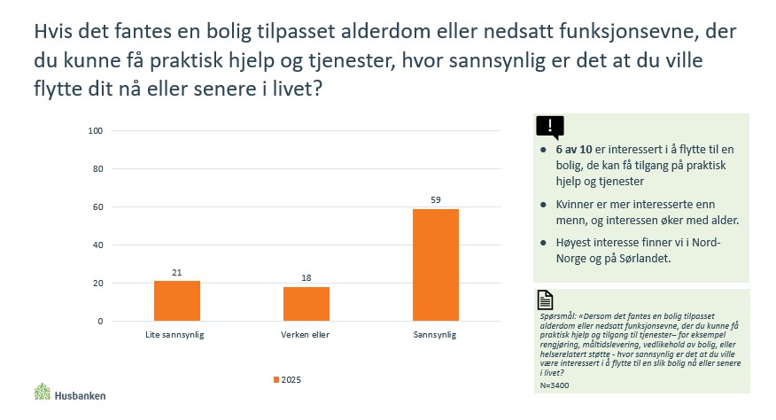 Dersom alternativet finnes, mener 6 av 10 at det er sannsynlig at de nå eller senere ville være interessert i å flytte til en bolig tilpasset alderdom eller nedsatt funksjonsevne, der de kunne få praktisk hjelp og tilgang på tjenester.