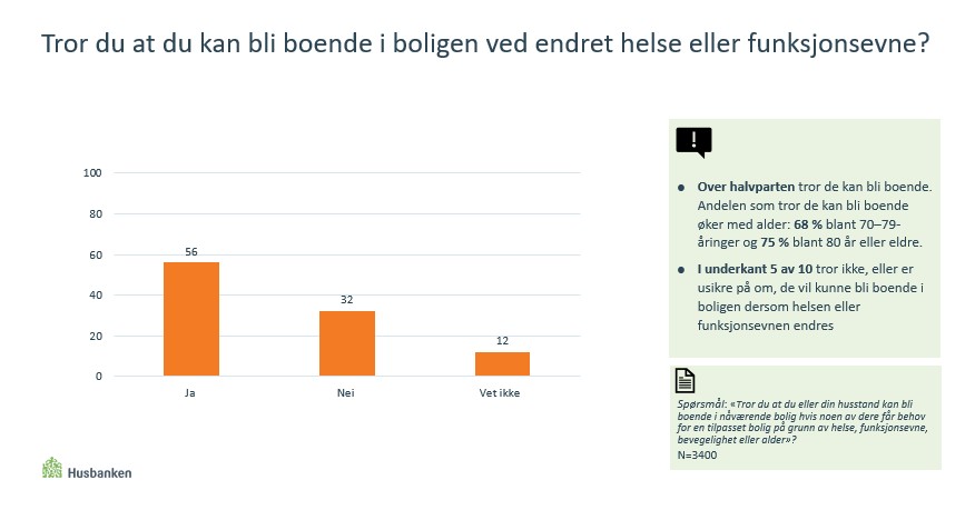 I underkant av halvparten av dem som har svart på Husbankens undersøkelse tror ikke, eller er usikre på om de kan bli boende i boligen sin ved endret helse eller funksjonsevne.