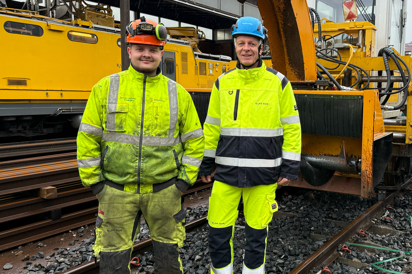 To menn i gule arbeidsklær foran gul skinnegående brøytemaskin