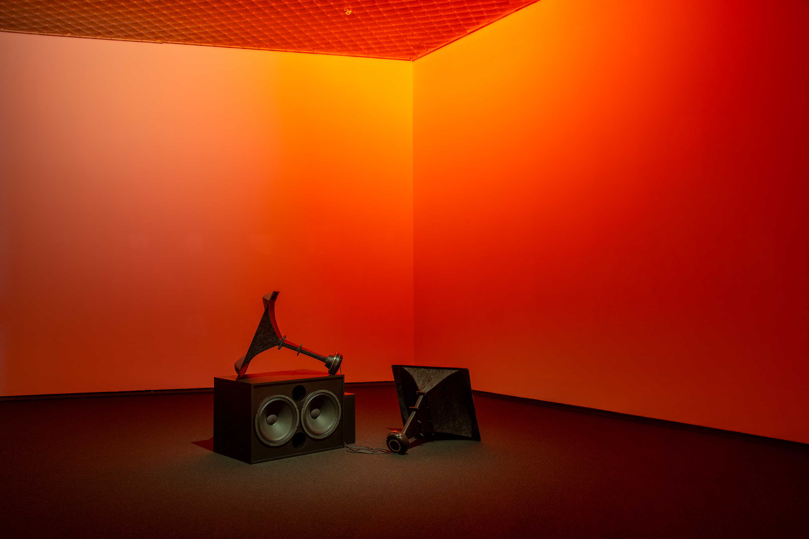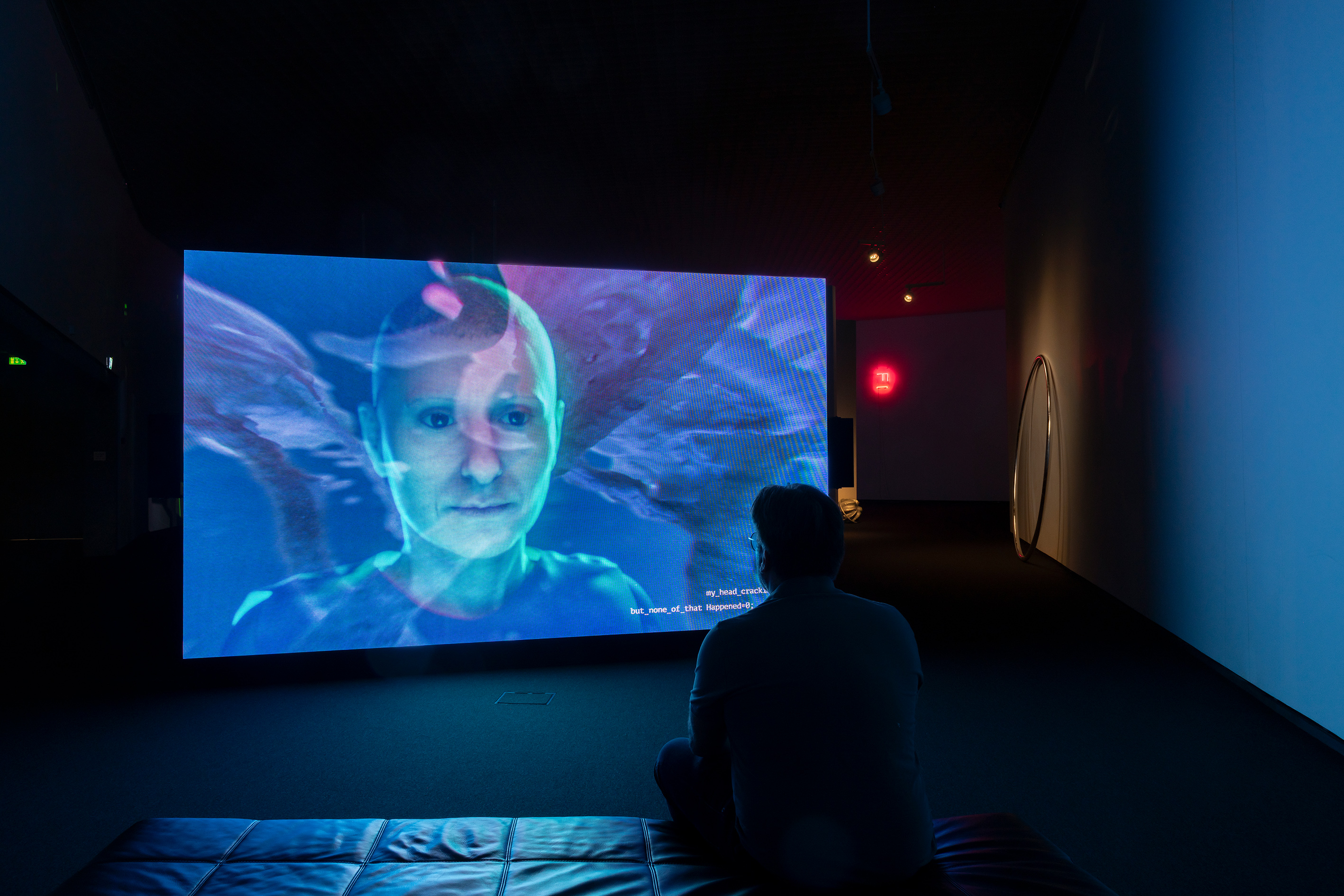 The works in the exhibition range from 16mm film, sculpture, drawing, sound works and neon to 3D animations on monumental LED screens. In the Prisma galleries, visitors encounter animations of cyborgs and hybrid animal figures as messengers from other futures, sounds of endangered bird species, drawings made by the artist under hypnosis, and sounds from distant galaxies.