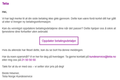 Epost-phishing eksempel – telefonnummeret oppgitt i eposten er ikke til Telia: