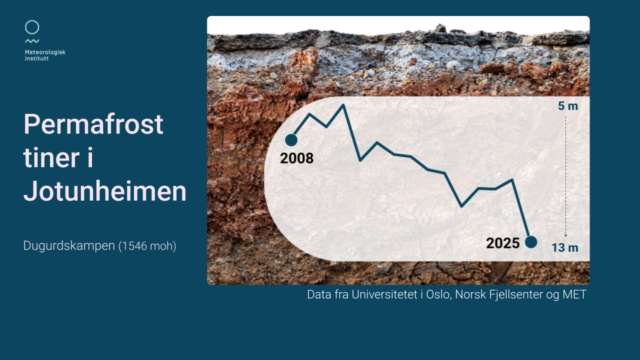 – Normalt går mye av energien fra sola om våren til å smelte snøen som ligger igjen etter vinteren. I 2025 gikk mye energi direkte ned i bakken, fordi det var lite snø. Det fører til enda raskere oppvarming. Våre analyser viser at jordtemperaturen i høyfjellet i Norge stiger raskere enn lufttemperaturen, sier Isaksen.