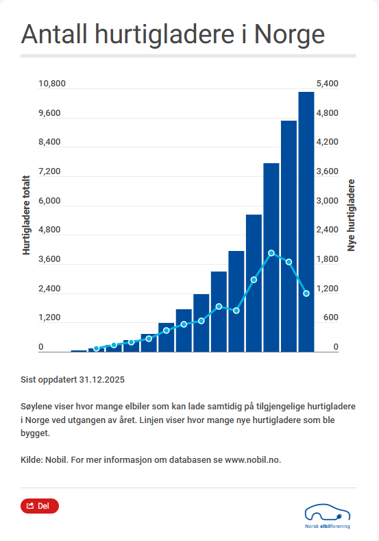 Ved inngangen til 2026 finnes det 10 670 hurtigladere for elbil langs norske veier.