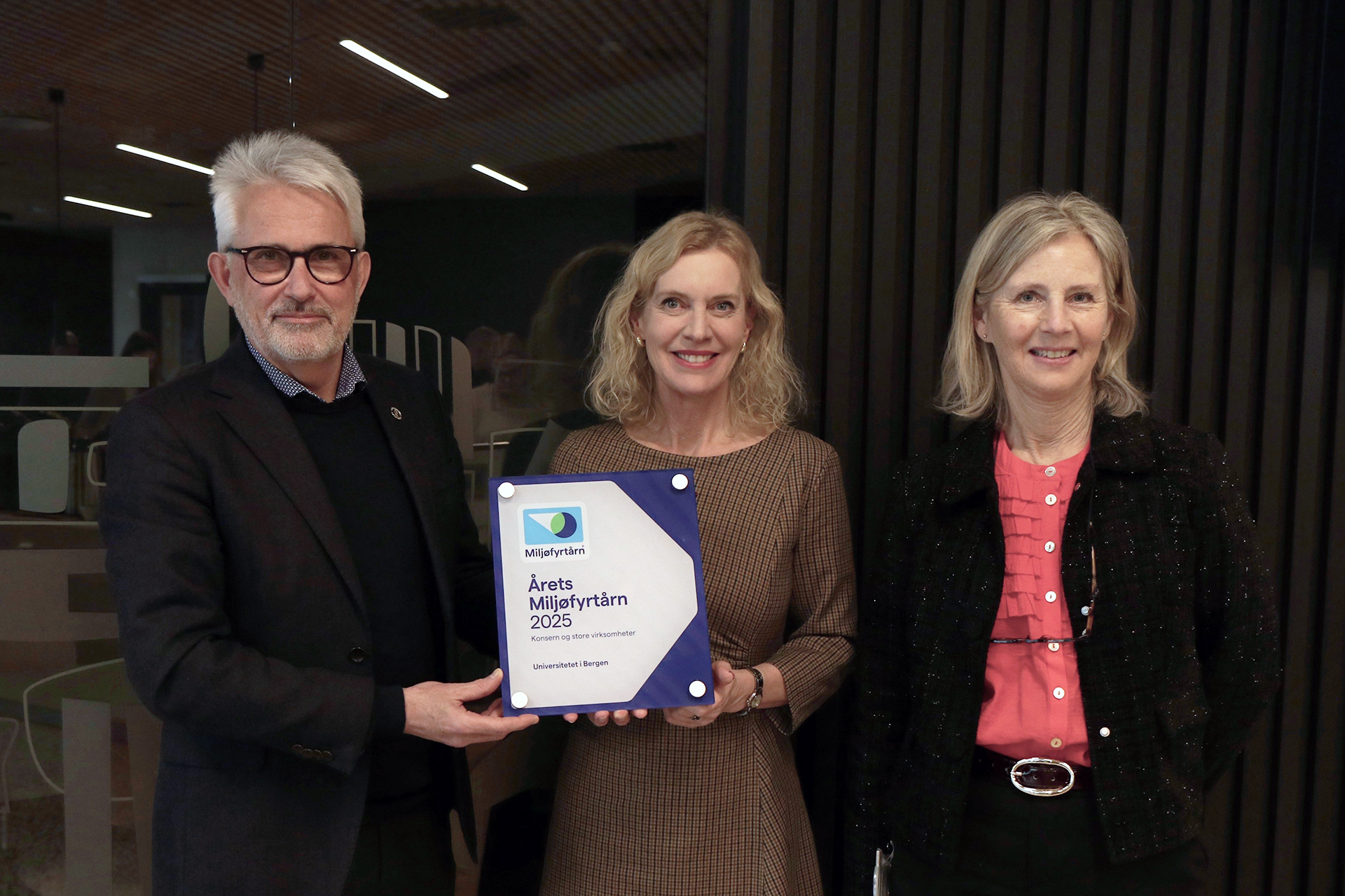 Viserektor ved UiB, Kjell-Morten Myhr, og universitetsdirektør Kari Fuglseth (t.h) mottok idag prisen for Årets Miljøfyrtårn 2025 fra administrerende direktør i Miljøfyrtårn, Ann-Kristin Ytreberg. Foto: Ole Marius Kvamme, Universitetet i Bergen.