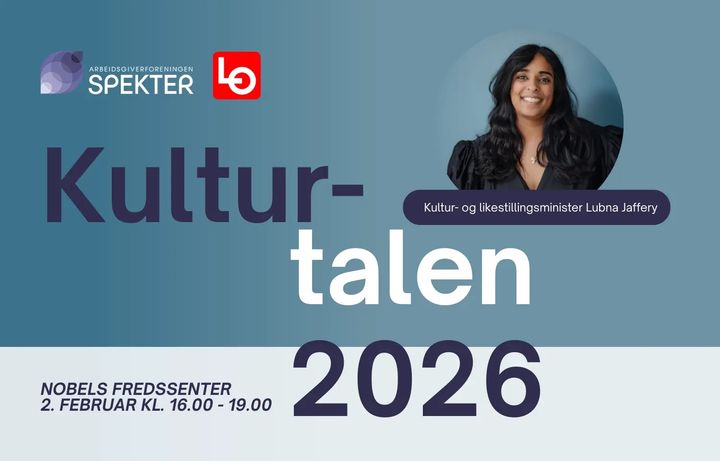 For fjerde år på rad inviterer Arbeidsgiverforeningen Spekter og LO til Kulturtalen, der kultur- og likestillingsminister Lubna Jaffery trekker opp de lange linjene, visjonene og prioriteringene for kulturpolitikken.