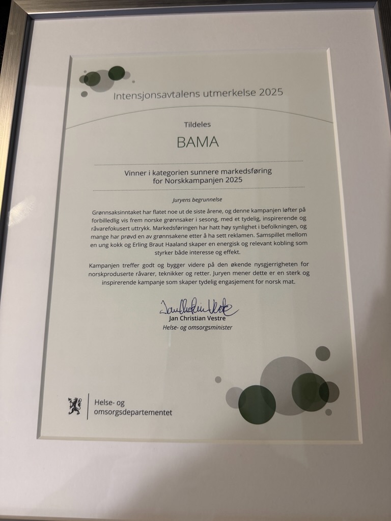 – Vi er svært glade for å motta gull i Intensjonsavtalens utmerkelse for sunnere markedsføring. Hvert år gjennomfører vi i BAMA, sammen med Gartnerhallen, en stor markedskampanje for å fremme norske grønnsaker i sesong, sier Jon Eivind Fornes, marketingdirektør i BAMA.