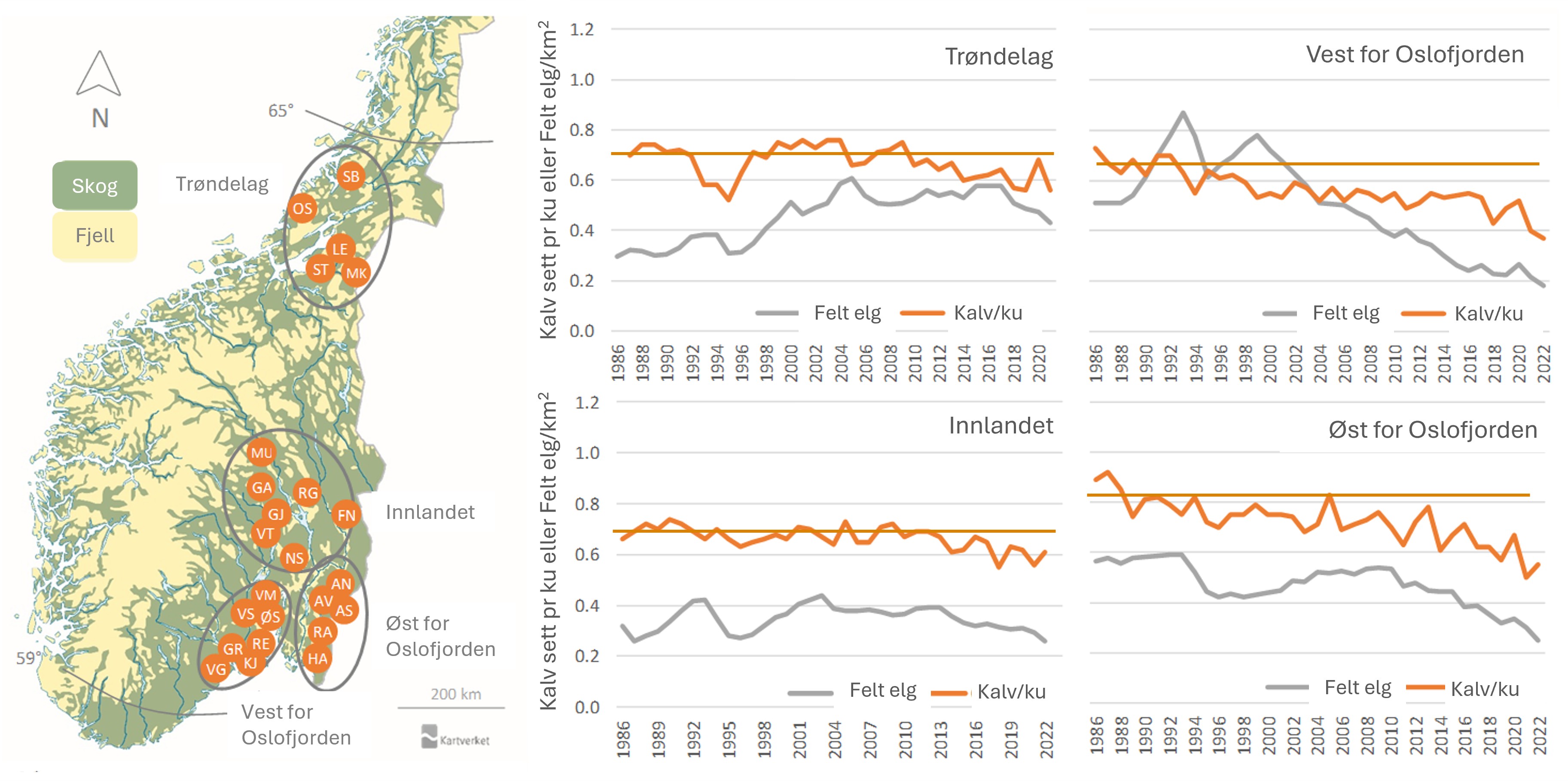 Forskerne fant denne typen historisk overbeite i store deler av Sør-Norge, særlig vest for Oslofjorden, der flere bestander viste tydelig redusert kondisjon sammenlignet med det man ville forvente ut fra dagens beitemengder.