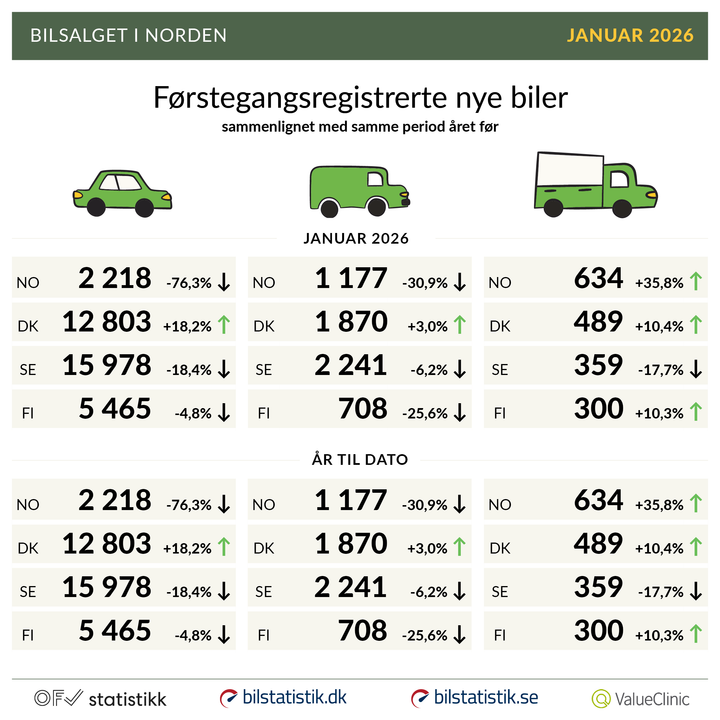 I Norge ble det som kjent registrert 2 218 nye personbiler i januar, en nedgang på 76,3 prosent sammenlignet med samme måned i fjor. Fallet må ses i lys av den sterke desemberavslutningen før avgiftsendringene ved årsskiftet.