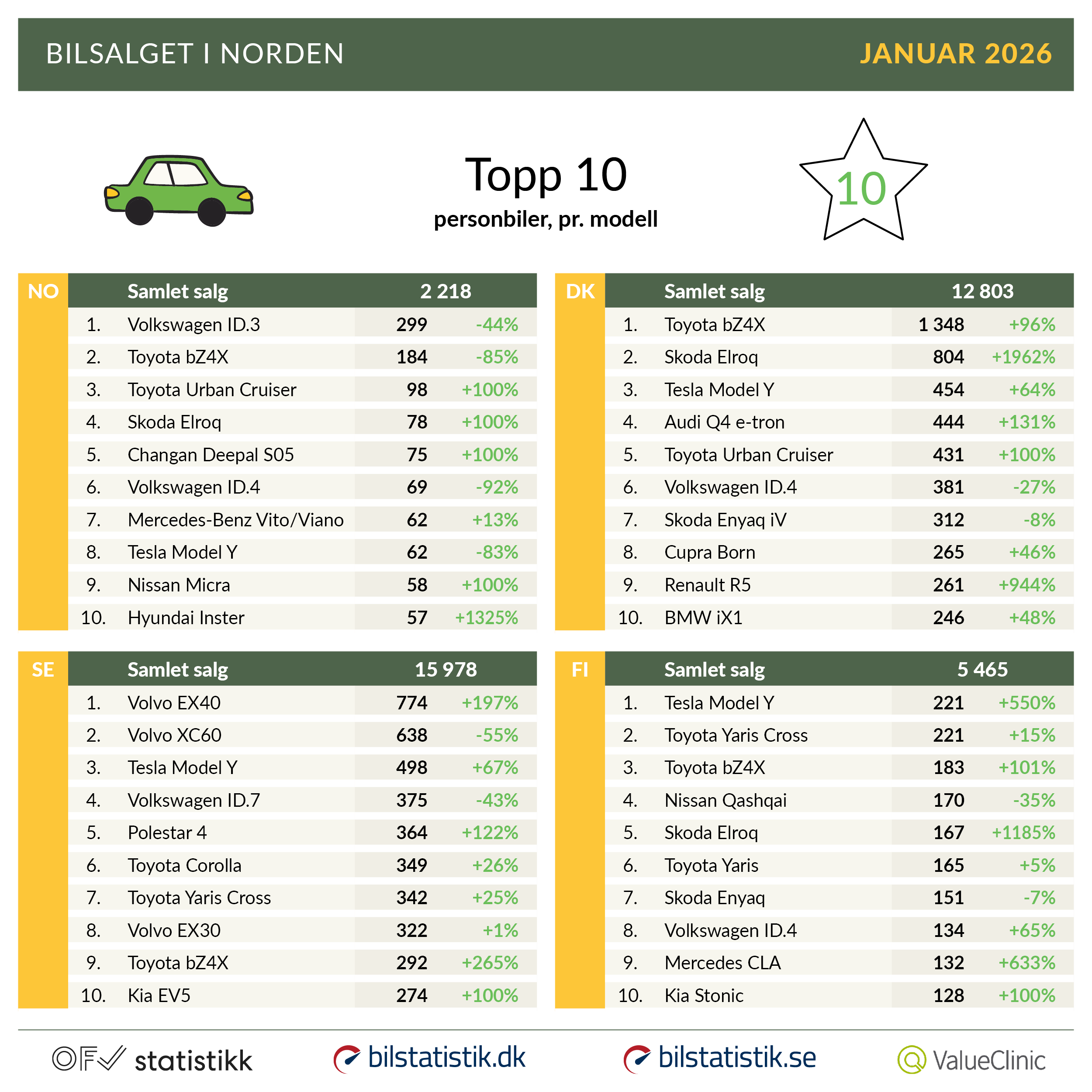 Danmark starter 2026 sterkt med en elbilandel på over 80 prosent for nybilregistreringene i januar. Finland opplever også en solid økning i elbilandelen sammenlignet med fjoråret. I Norge preges markedet av en nedgang i nybilsalget som følge av momsendringer ved årsskiftet, i likhet med Sverige som også opplever en nedgang i årets første måned.