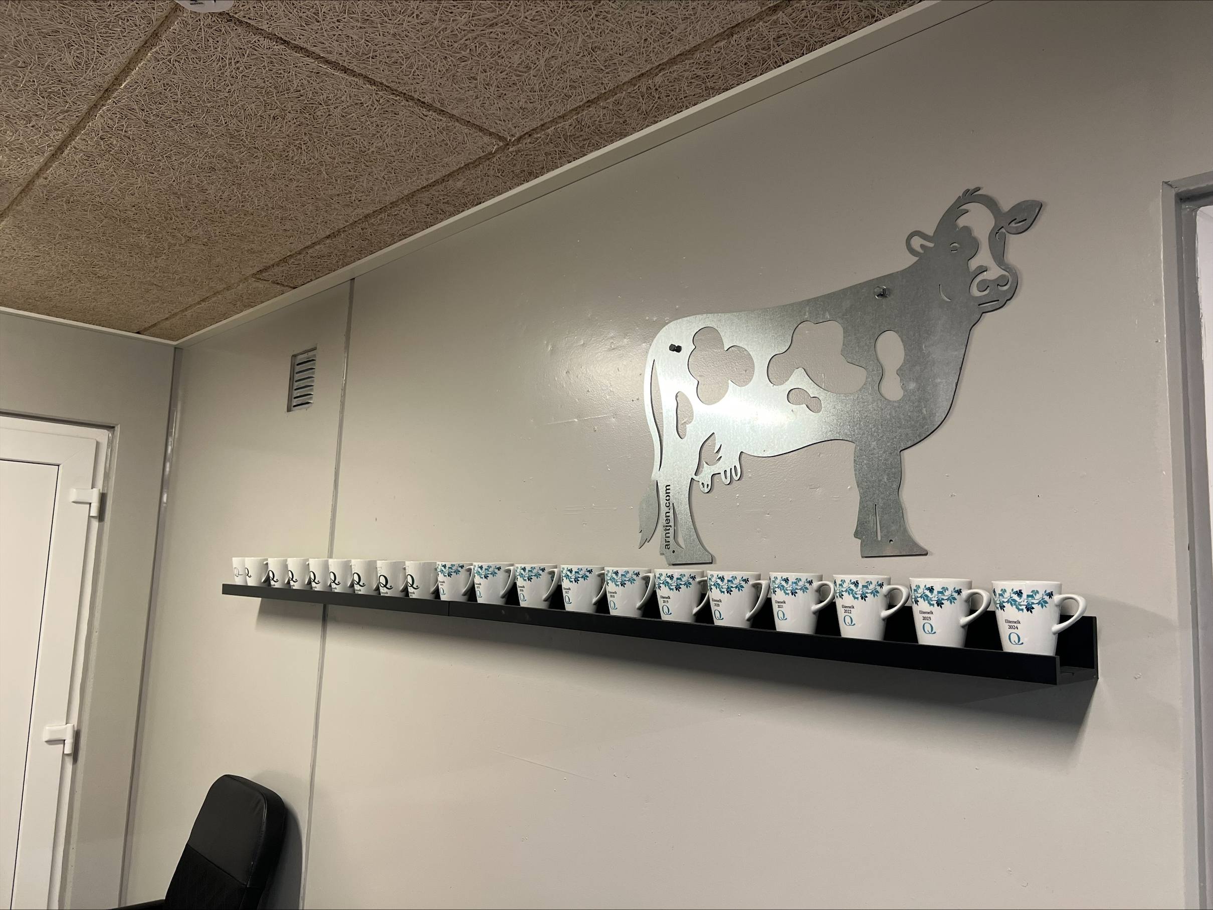 På hylla i melkerommet står Q-koppene som viser at faren til Ole Rasmus og han selv siden 2024 har levert Elitemelk i 20 år. Det betyr beste kvalitet på melken, med ingen avvik ila 20 år.