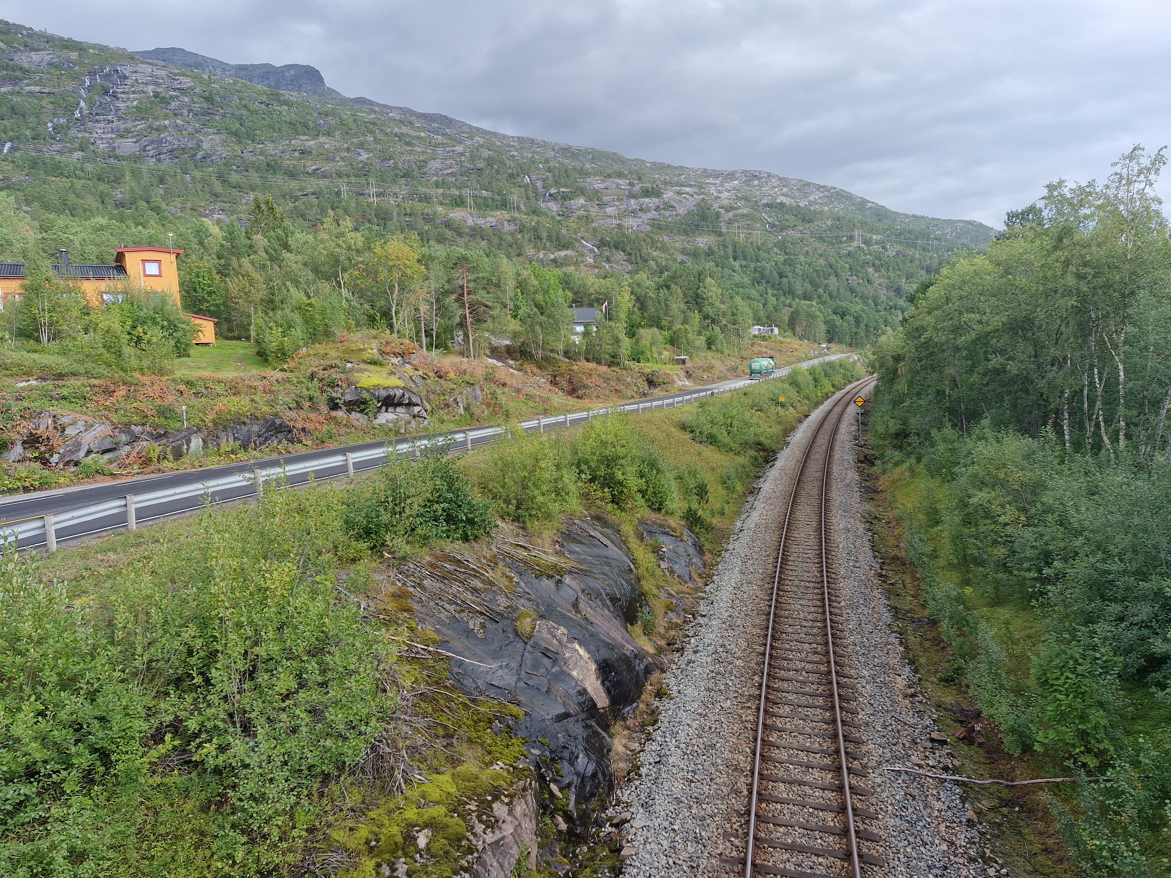 Bildet viser at rv. 80 og Nordlandsbanen går parallelt mange steder. Bildeteksten sier, Krevende utbygging: Næhet til Nordlandsbanen og liten plass mellom skinnegang, veg og bebyggelse gjør utbyggingen mer krevende.