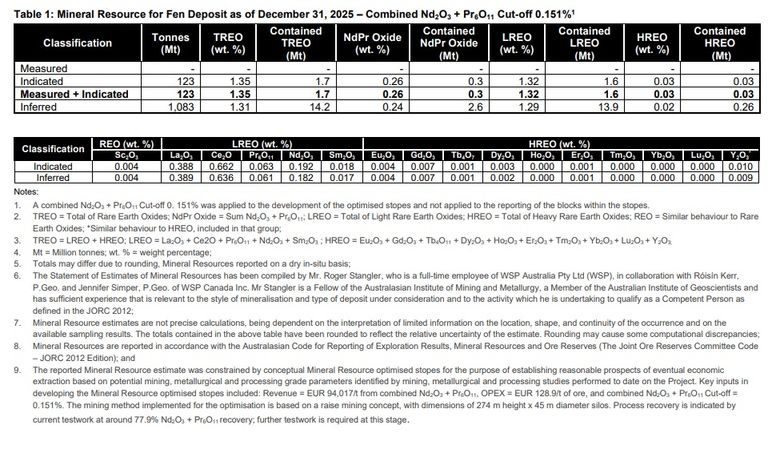 Mineral Resource for Fen Deposit as of December 31, 2025