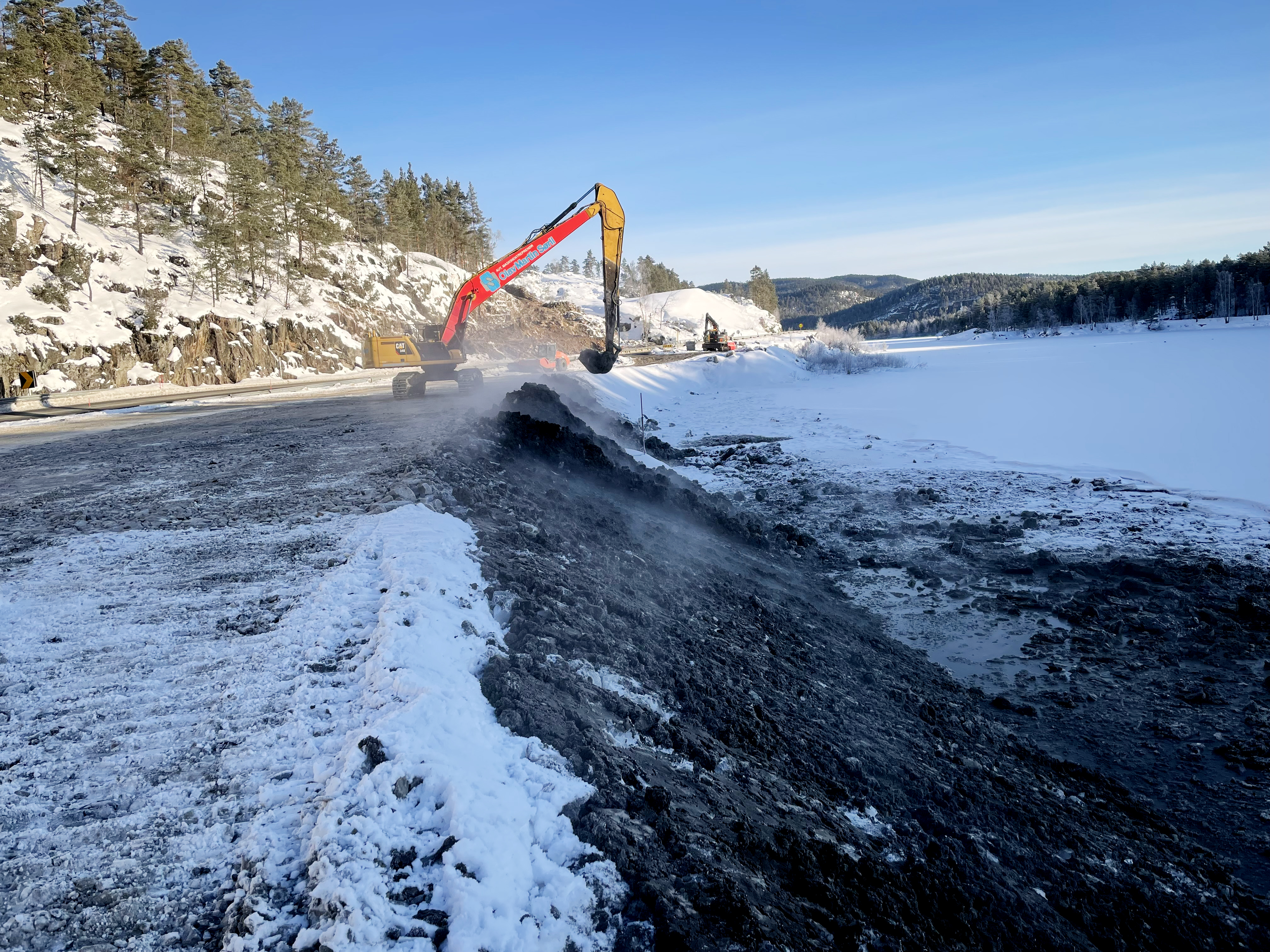 – Planen er å legge ut vegen som nå ligger langs Pederstjønn. Det er dårlige grunnforhold her, og over 20 meter dypt vann i Pederstjønn. På grunn av dette er det nødvendig å stenge vegen når vi nå skal bygge ny veg på denne strekningen, forteller byggelederen.