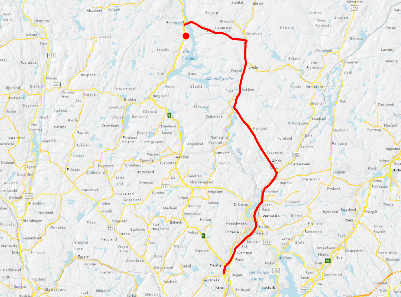 Mens rv. 9 er stengt, blir det skiltet omkjøring via fv. 405 og 403.