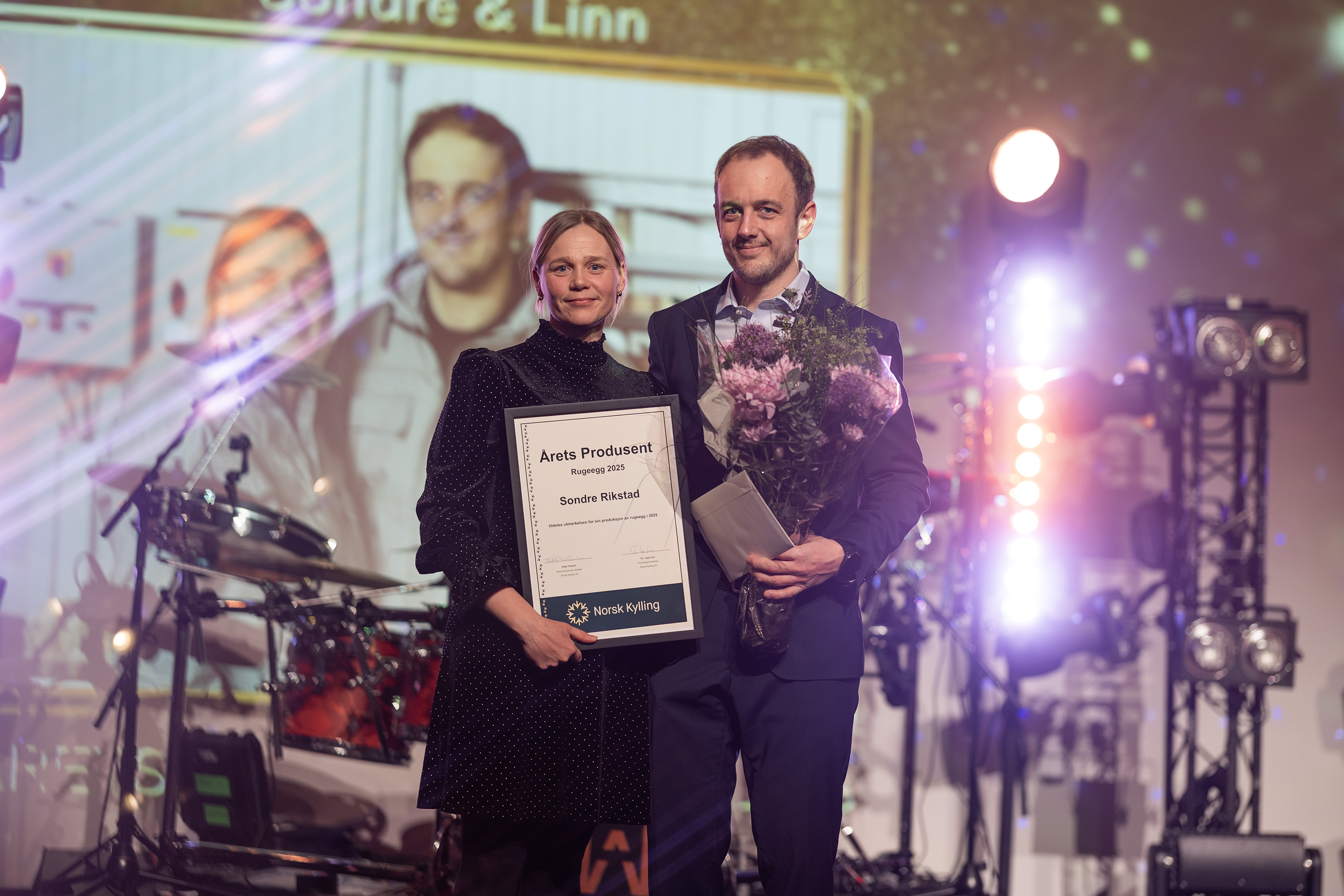 Sondre og Linn Rikstad fra Meldal mottar i år to av Norsk Kyllings hederspriser: Årets produsent oppal og Årets produsent rugeegg. Ekteparet driver to separate produksjoner, og driver de to mest krevende delene av slaktekyllingproduksjon. I alt har de ca. 2 500 kvm fjøsareal på gården, med klimavennlige energiløsninger som flisfyring og vannbåren varme. Innen rugeegg produserer de på full konsesjon med 7 500 høner.