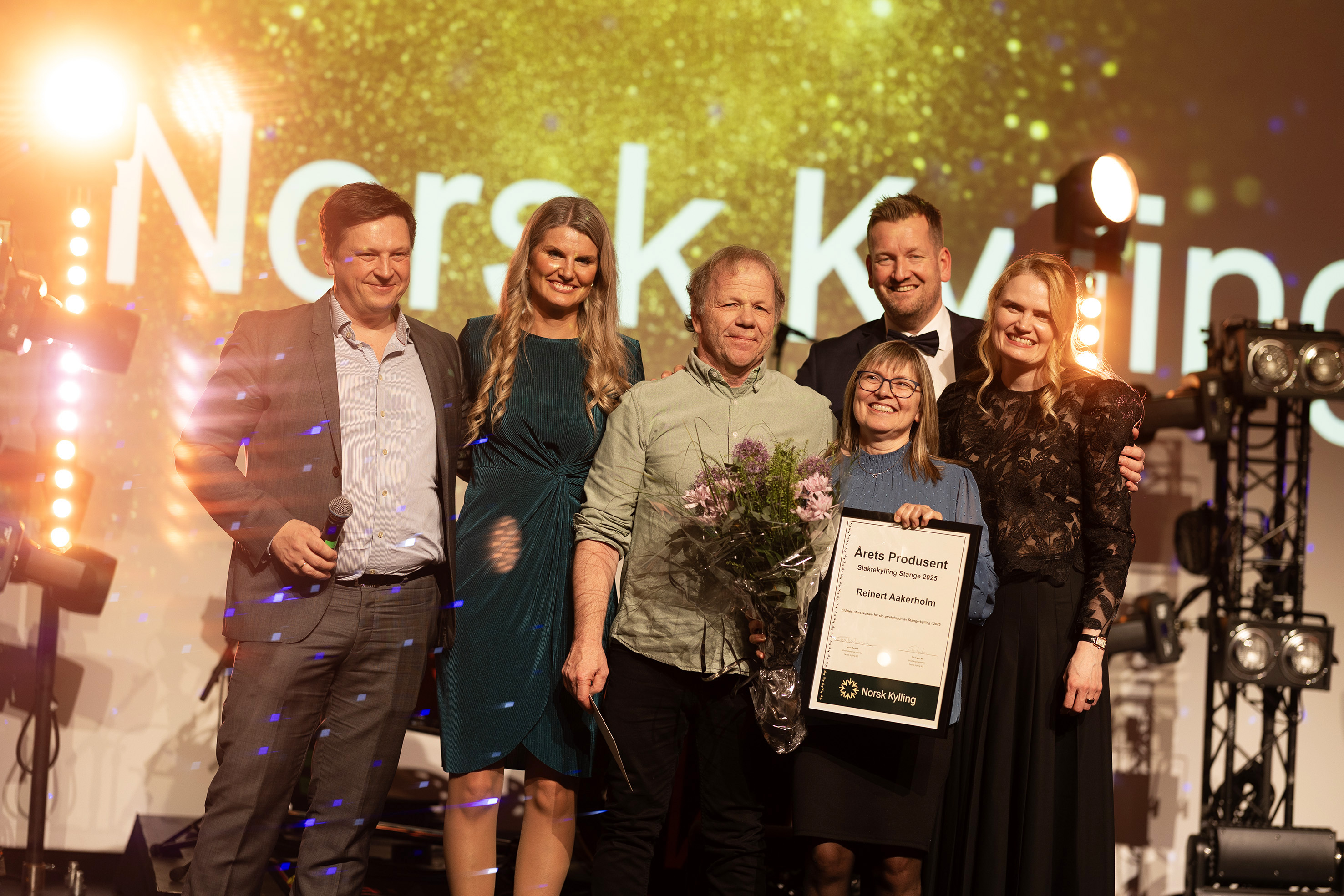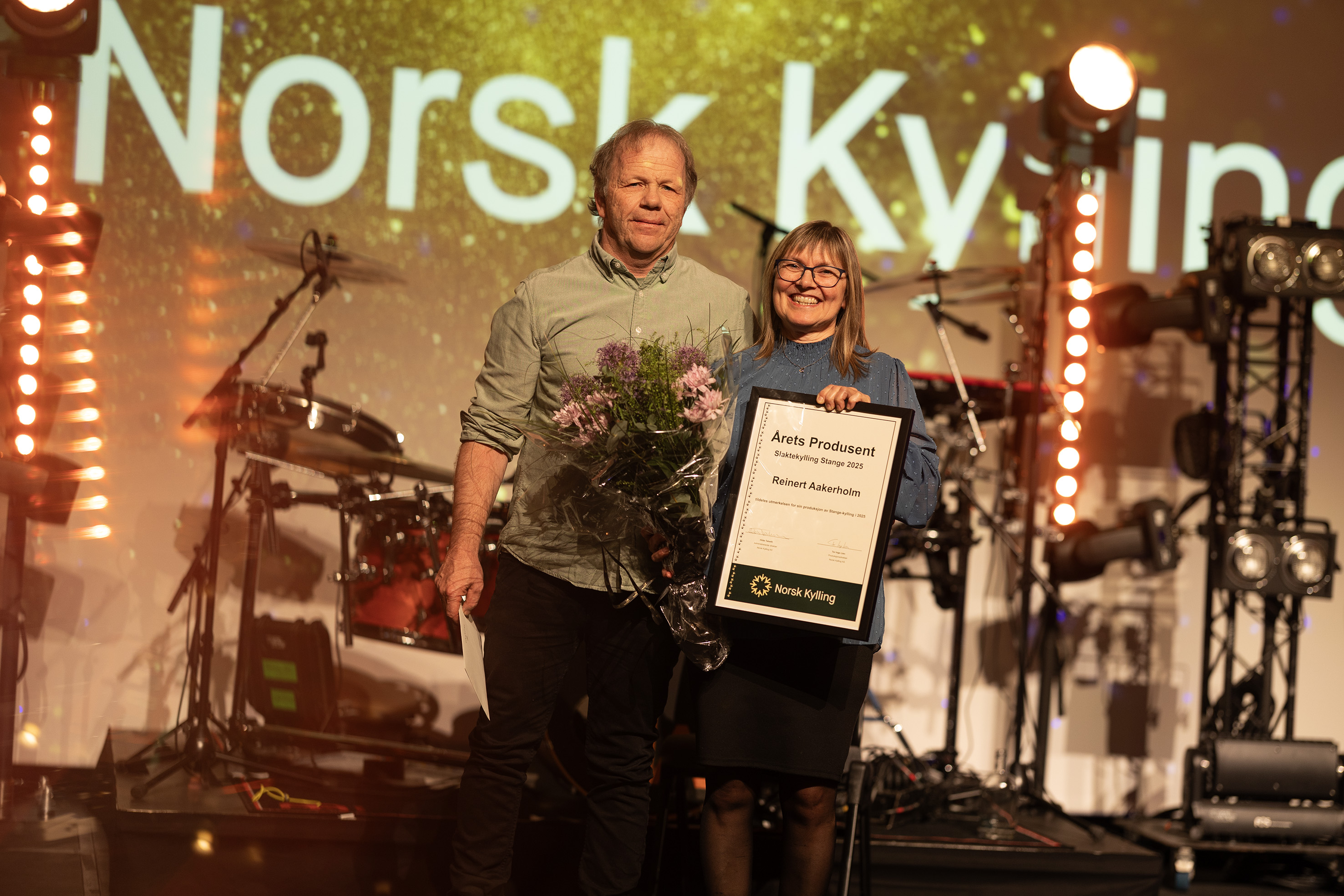 Prisen Årets produsent slaktekylling Stange gikk til Reinert Aakerholm, som driver gården sammen med kona Grete Lill i Orkland. Ekteparet har slaktekyllingproduksjon i to fjøs, og har ca. 2000 m2 med fjøsareal til kylling. Begge fjøsene har flisfyring og varmevekslere. I 2025 leverte de 126 500 kyllinger til Norsk Kylling.