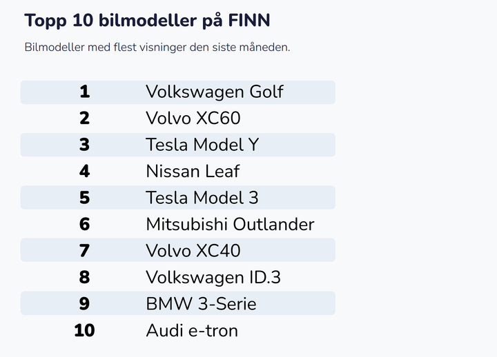 Volkswagen Golf var modellen med flest visninger på FINN i februar. Deretter fulgte Volvo XC60 og Tesla Model Y.