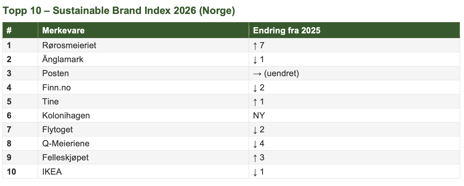 OSLO, 11. mars 2026: Rørosmeieriet tar førsteplassen i årets Sustainable Brand Index (SBI), Europas største uavhengige merkevarestudie om bærekraft. Det heløkologiske meieriet fra Røros går forbi fjorets vinner Änglamark, og har klatret fra 13. plass i 2023 til å toppe listen over 280 merkevarer, vurdert av 10 000 norske forbrukere.