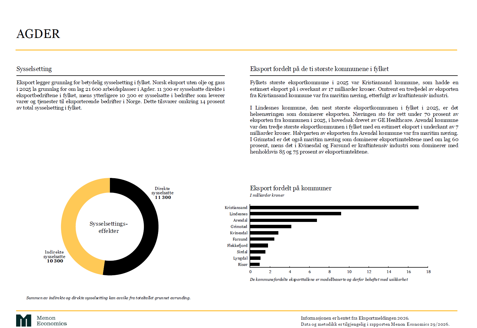 – Agder har et eksportnæringsliv med sterke industrimiljøer og en maritim næring som står sentralt i verdiskapingen. Samtidig ser vi at nye næringer vokser frem, blant annet innen helse. Eksporten fra fylket bidrar til betydelig sysselsetting i fylket, med omlag 21 600 arbeidsplasser, sier Sveinung Hovstad, leder for Innovasjon Norge i Agder.