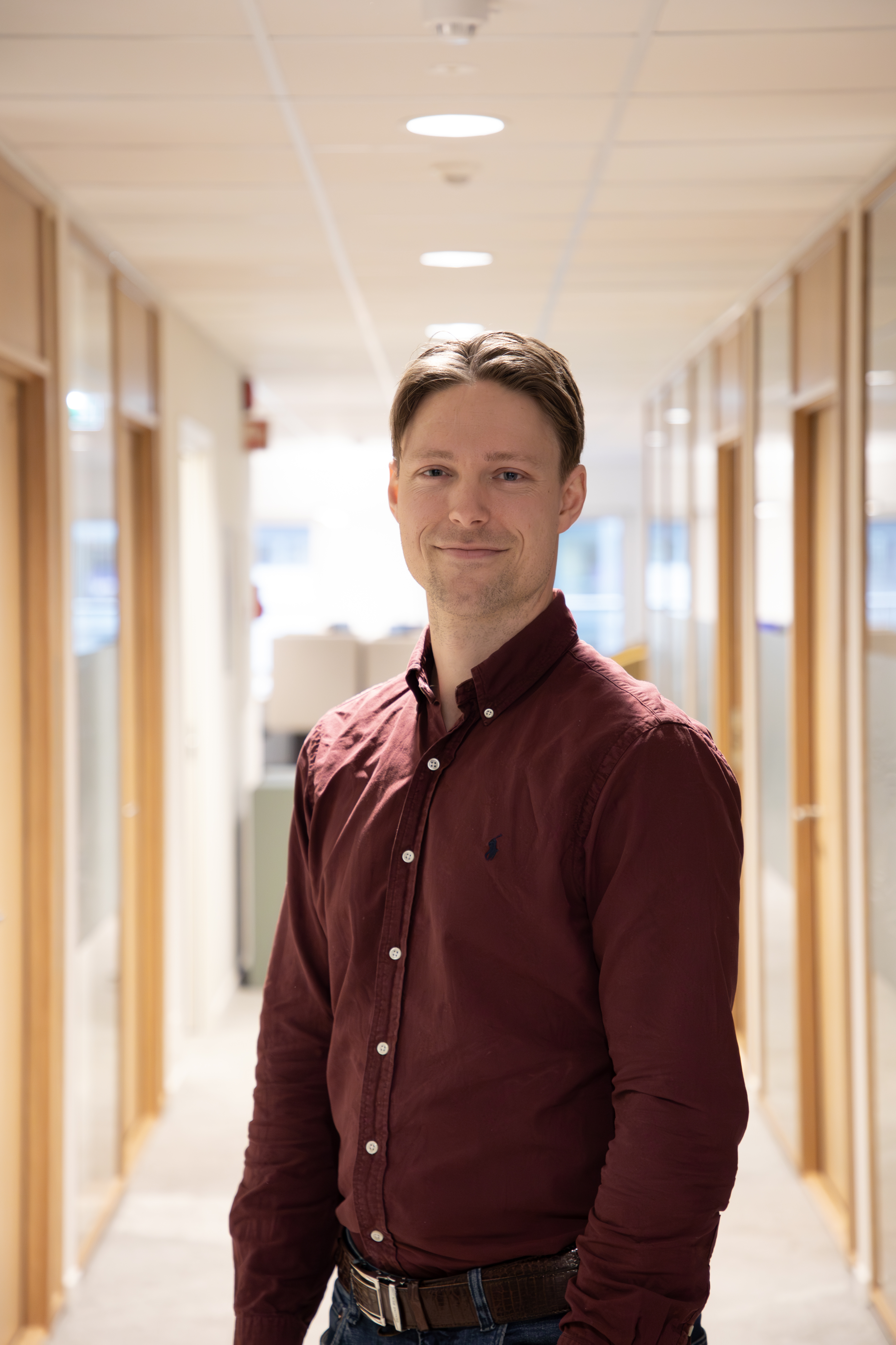 En mann i burgunderrød skjorte står i en kontorkorridor.