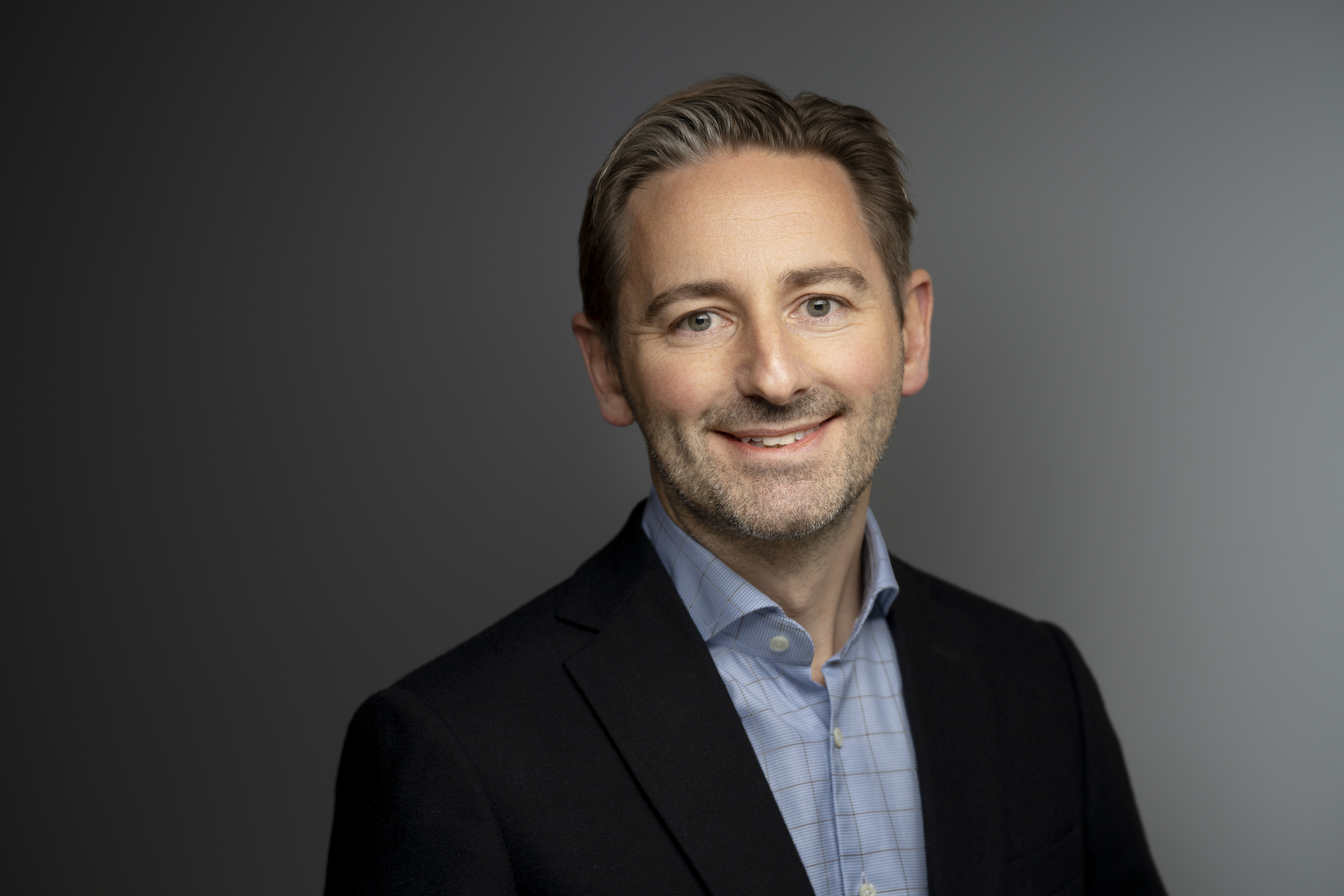 Portrett av en mann i dressjakke og lys blå skjorte.