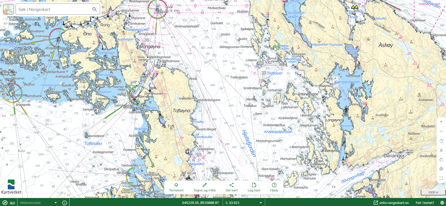 Bilde av et detaljert nautisk kart over et område i Norge, vist på Norgeskart.no.