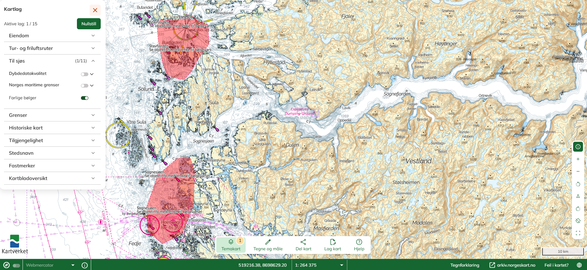 Skjermbilde av Norgeskart.no med ulike kartlag og markeringer.