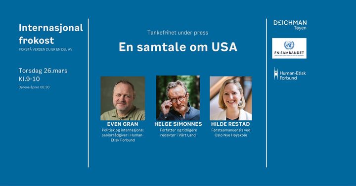 26. mars: FN-sambandet, Deichman Tøyen og Human-Etisk Forbund inviterer til en internasjonal frokost om «Tankefrihet under press – en samtale om USA». Les mer om arrangementet og meld deg på.