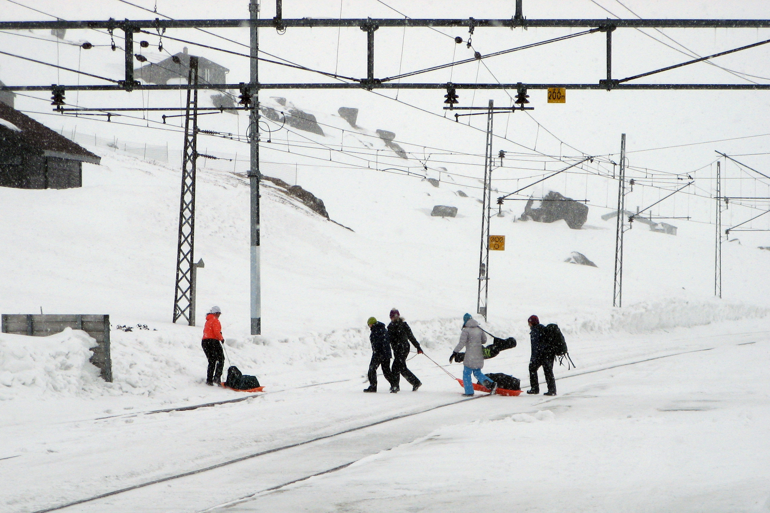 Fem personer med bagasje trekker oppakning over sporet på pulk/akebrett.