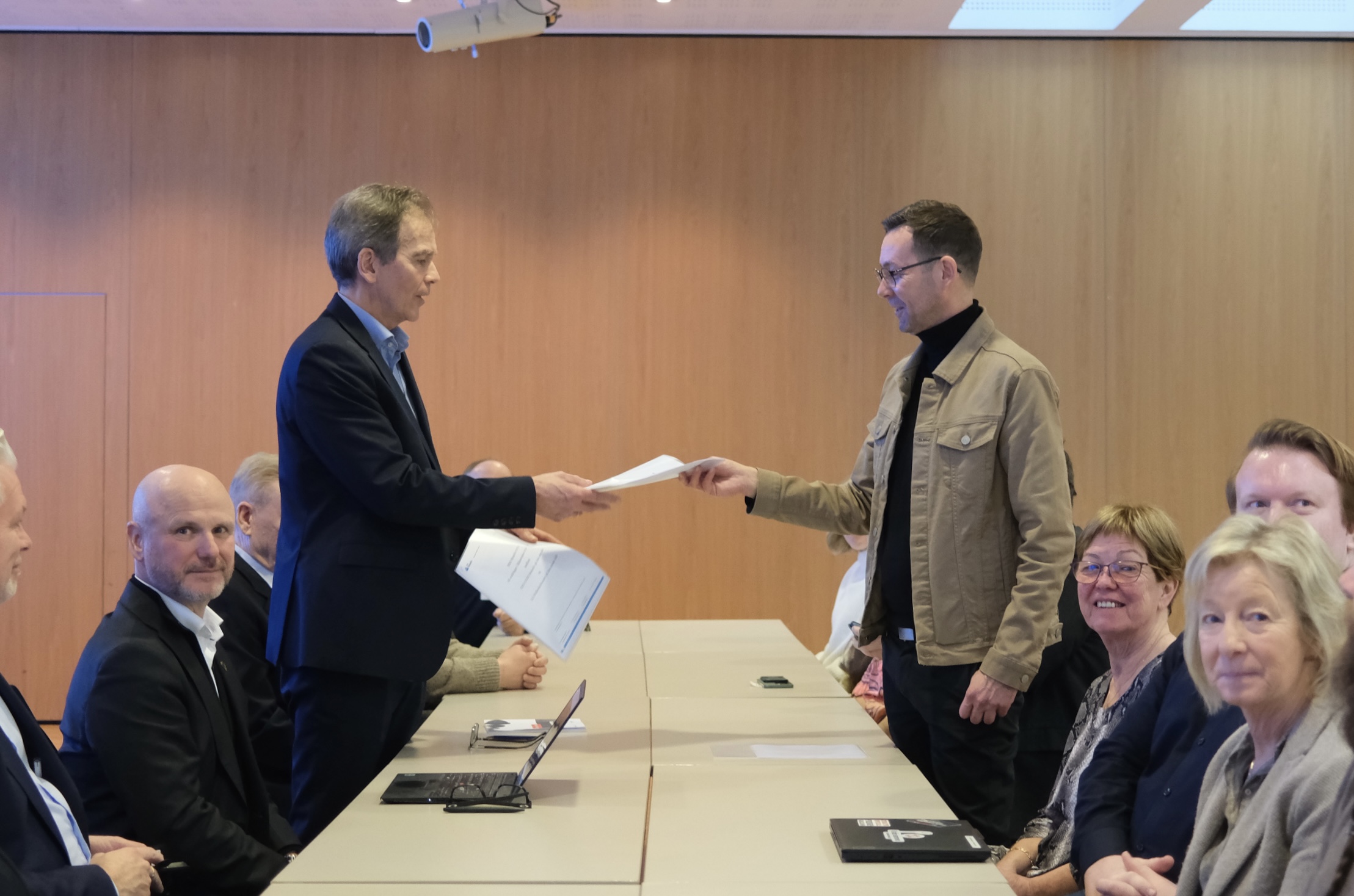 Fellesforbundets forhandlingsleder Clas Delp utveksler krav med Magne Kristensen fra NHO Reiseliv. Sara Kvam / Fellesforbundet