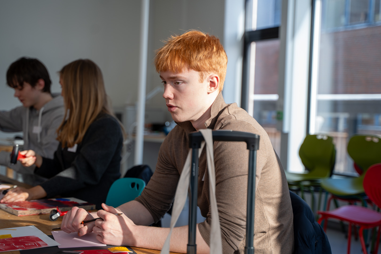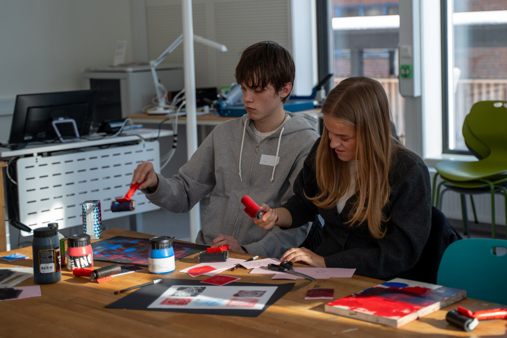 Vg2-elevene fikk blant annet være med på en kunst-og håndverkstime på UiT, som resulterte i fine trykk. Fra v. Elvina Kobro Hammer, Leo Alexander Nymark og Henrik Øisund Sverresvold.