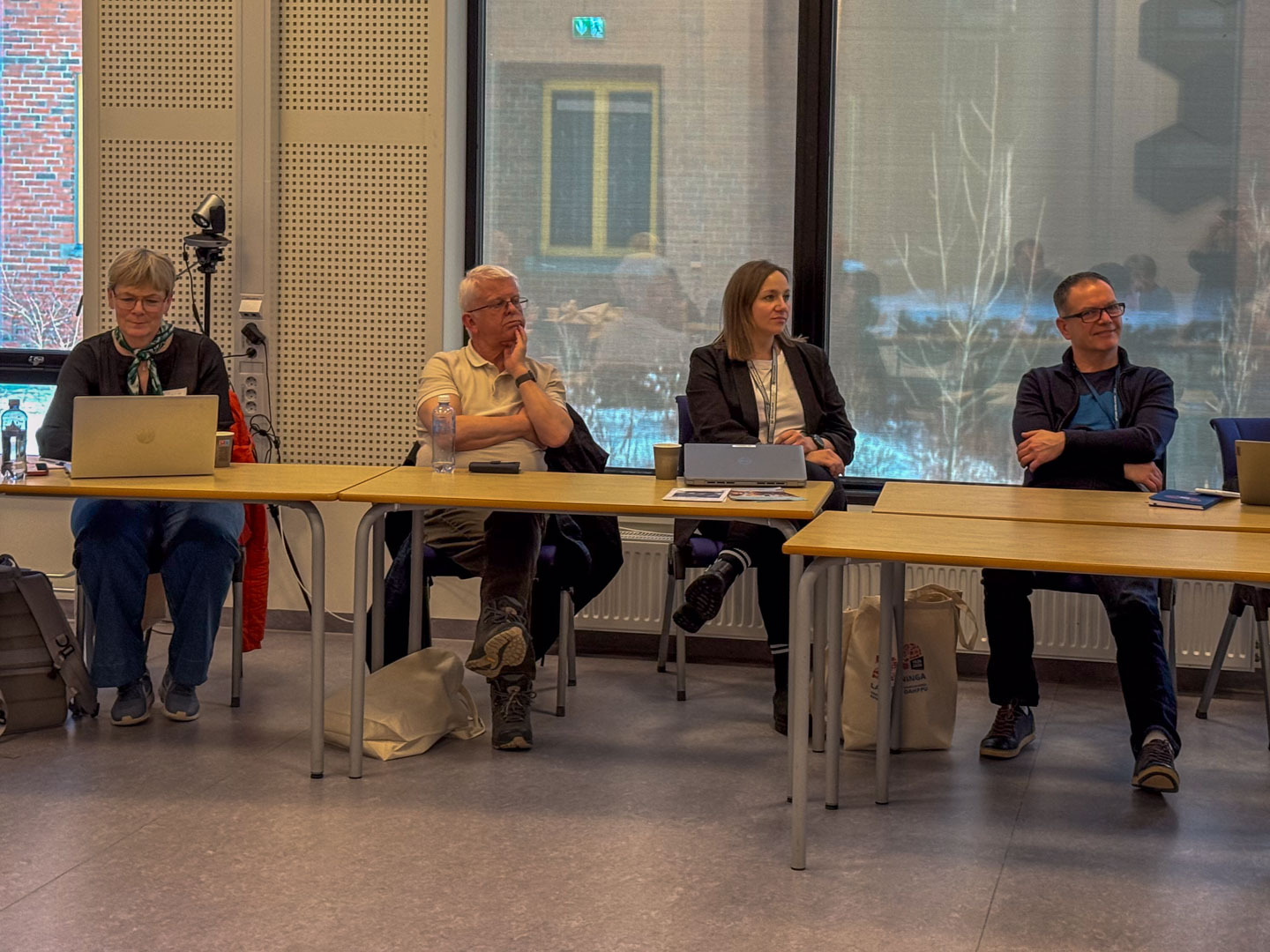 Fire personer sitter ved en benk og diskuterer.