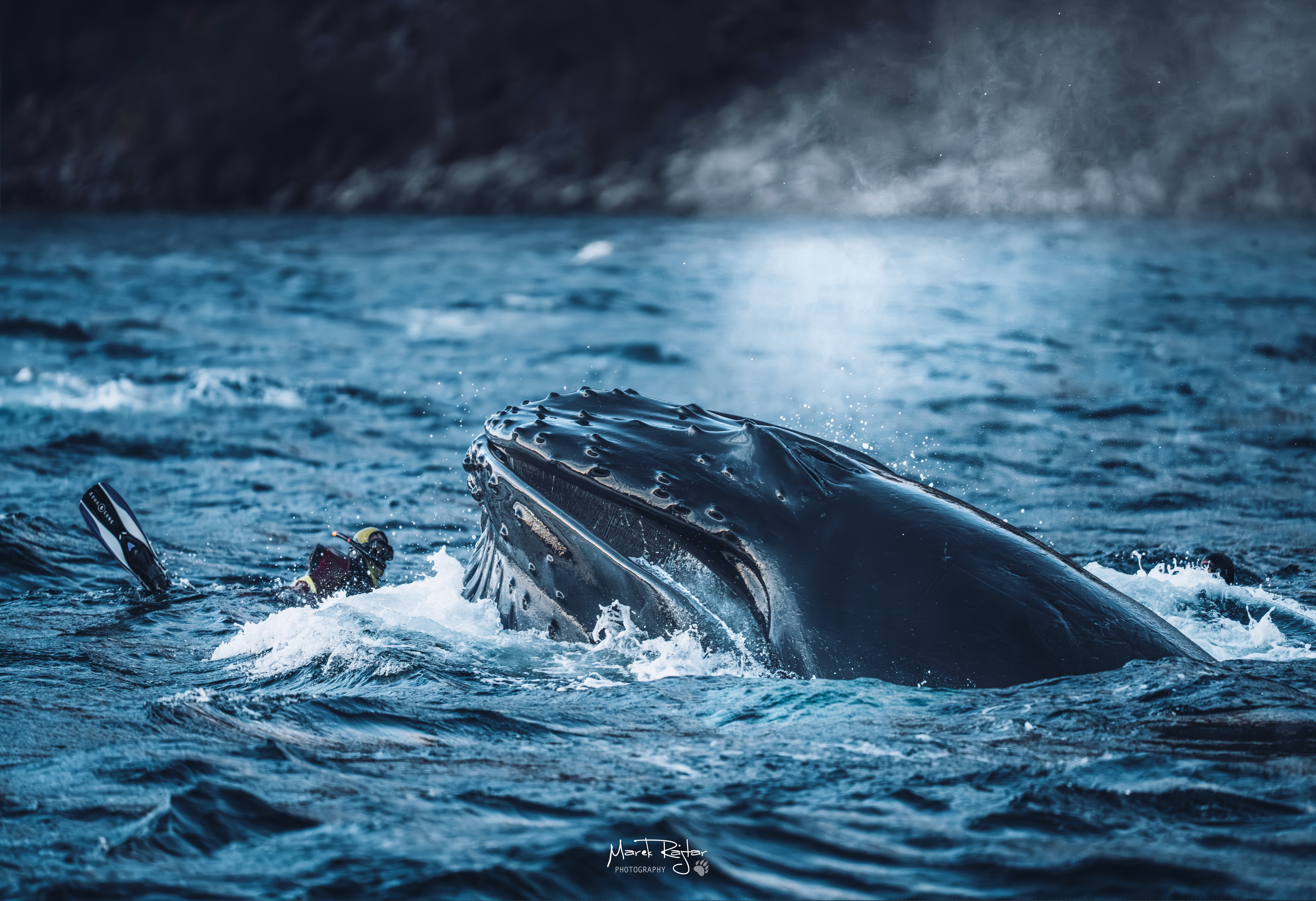 Båter som setter snorklere i vannet opererer inne i hvalflokkene mens de spiser – den eneste måten snorklerne kan se dyrene i mørket på vinterstid.